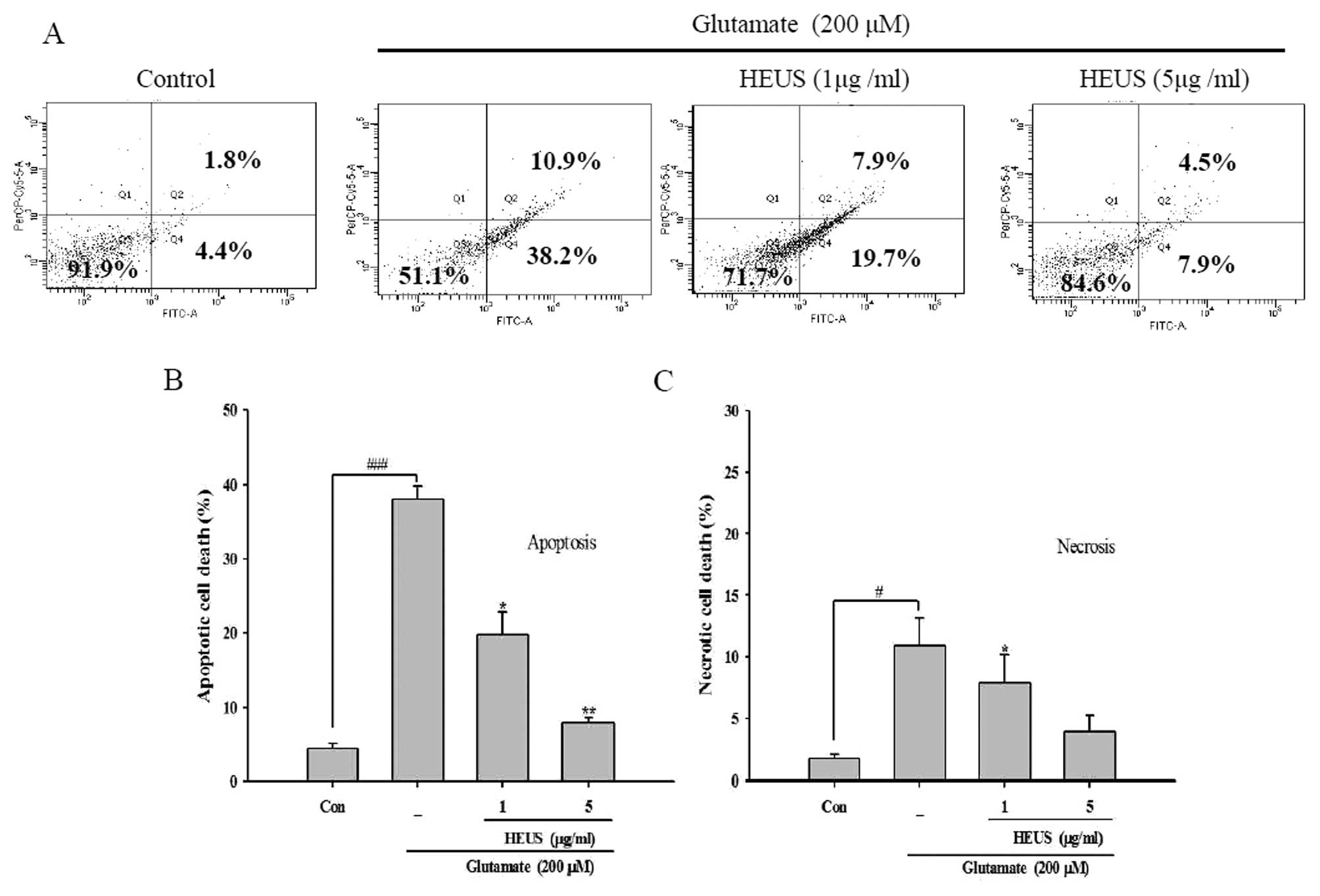 Findings from recent studies suggest an association of glutamate-triggered cell death with both apoptotic and necrotic processes (18). In order to determine the type of cell death induced by glutamate, we performed several morphological assessments under our experimental conditions. Upon nuclear staining with Hoechst 33342, cortical neurons showed typical morphological signs of apoptosis, including nuclear and cytoplasmic shrinkage, and chromatin condensation, after exposure to glutamate, compared with control cells, which had regular and round-shaped nuclei. However, treatment with HEUS resulted in a significant reduction in these apoptotic features by ∼30.8, 22.6, 13.2 and 7.0% from 33.2% as observed in the glutamate-treated cells at a concentration of 0.1, 0.5, 1 and 5 μg/ml, respectively (Fig. 2A). Next, we performed TUNEL staining, which is designed for detection of DNA strand breaks and quantitation of apoptosis. Consistent with the results of Hoechst staining, after exposure to glutamate, cortical neurons showed a ratio of nuclear DNA fragmentation in total cells to 37.3%. Treatment with HEUS resulted in a marked reduction in TUNEL-positive cells to 18.0 and 7.0% at a concentration of 1 and 5 μg/ml, respectively (Fig. 2B). We further confirmed our results by performance of flow cytometry with Annexin V FITC/PI staining. The percentage of apoptosis in glutamate-treated neurons was up to 38.2%, while the proportion of necrotic cells showed a slight increase to 10.9% (Fig. 3). These results indicated that after exposure to glutamate, cortical neurons underwent extensive apoptotic-like deaths under our experimental conditions. However, treatment with HEUS resulted in a significant decrease in the number of glutamate-induced apoptotic cells, from 19.7 to 7.9%, at a concentration of 1 and 5 μg/ml, respectively (Fig. 3A). These results suggest that pretreatment with HEUS results mainly in protection of cortical cells against glutamate-induced neuronal apoptosis.