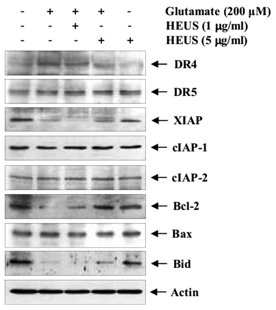 Next, we observed that pretreatment with HEUS resulted in significantly enhanced levels of expression of glutamate-attenuated XIAP, Bcl-2, and marked blockade of glutamate-induced cleavage of Bid (Fig. 4). These results indicated that the anti-apoptotic effect of pretreatment with HEUS is not a direct result of altered receptor expression, and that it should induce potent inhibition of both extrinsic and intrinsic apoptosis pathways involved in extrinsic/receptor-mediated cascades (i.e., by downregulation of DR4) and the intrinsic/mitochondrial-mediated apoptotic pathway (i.e., by upregulation of XIAP, activation of Bcl-2, and downregulation of Bid cleavage). These findings are particularly important since Bcl-2 is known to exert protective action through regulation of mitochondrial membrane potential and to block release of cytochrome c through caspase cleavage (26).