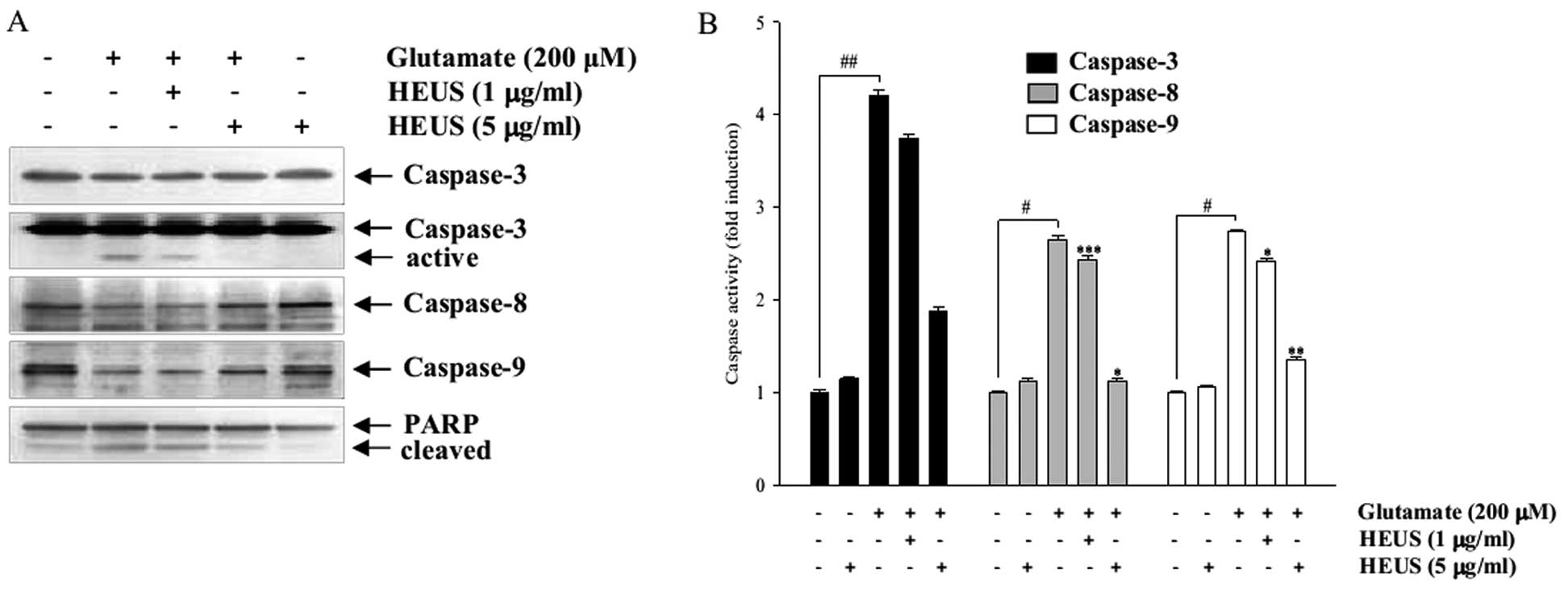 Thus, through use of western blot analysis and caspase activity assay, we extend our observation of downstream events of cascase cascade activation. Pretreatment with HEUS resulted in marked attenuation of glutamate-induced caspase-8, -9 and -3 activities, subsequently leading to blocked degradation of PARP-1, caspase-3 target protein (Fig. 5). These results suggest that pretreatment with HEUS can result in strong suppression of glutamate-induced apoptosis through inhibition of a caspase-dependent pathway, which might contribute to the neuroprotective effect of pretreatment with HEUS.