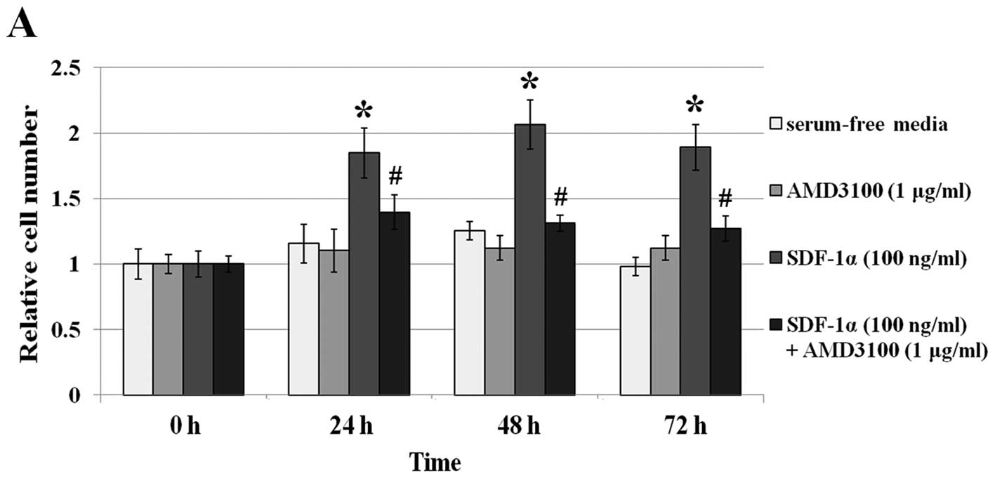 Cells (3.6×105/well) were seeded on 6-well plates and incubated in growth medium for 24 h. Cells were starved with serum-free media for 24 h. For CXCR4 inhibition, the cells were pretreated with AMD3100 (1 μg/ml) for 2 h and then rhSDF-1α (100 ng/ml) or rhMIF (50 ng/ml) was added for 24–72 h. The cells were stained with 0.4% Trypan blue and cell counting was performed using a Countess® cell counting chamber slide and Countess automated cell counter (Invitrogen Life Technologies). This experiment was repeated three times.