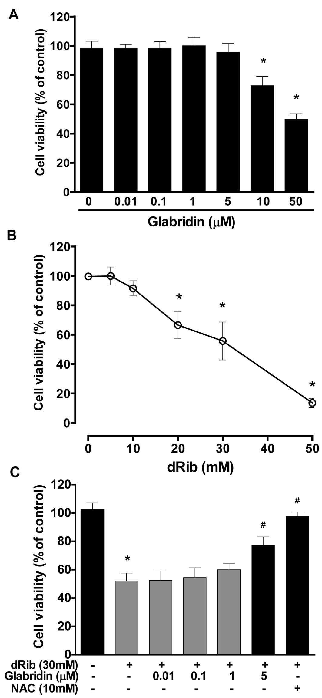 To evaluate the effect of glabridin itself on MC3T3-E1 osteoblastic cell survival, cells were incubated in α-MEM containing 0.5% FBS with increasing concentrations of glabridin (0.01–50 μM) for 24 h and then cell viability was determined using the CCK-8 assay. Glabridin at concentrations of 0.01–5 μM had no effect on cell viability, while higher doses (>10 μM) were found to be cytotoxic in a dose-dependent manner (Fig. 1A). Therefore, we chose the highest non-toxic concentration of glabridin (5 μM) for all subsequent cell culture experiments. To evaluate the effect of dRib on MC3T3-E1 osteoblastic cell survival, cells were incubated for 24 h in α-MEM containing 0.5% FBS with increasing concentrations of dRib (10–50 mM). We observed a dose-dependent decrease in cell viability in cells exposed to various concentrations of dRib for 24 h (Fig. 1B). Based on the results of these cytotoxicity studies, we used 30 mM of dRib in subsequent biochemical assays. At this concentration, ~50% inhibition of cell viability occurred in 24 h under our experimental culture conditions. To determine whether glabridin had an effect on the dRib-induced decrease in cell survival, cells were preincubated with glabridin for 30 min and then cultured in the presence of 30 mM of dRib for 24 h. The CCK-8 assays revealed that glabridin (5 μM) partially reversed the dRib-mediated reduction in cell viability (Fig. 1C). The antioxidant N-acetyl-L-cysteine (NAC) was used to investigate the mechanism of dRib-induced cell damage. Pretreatment of cells with 10 mM of NAC almost completely reversed the dRib-induced cytotoxicity.