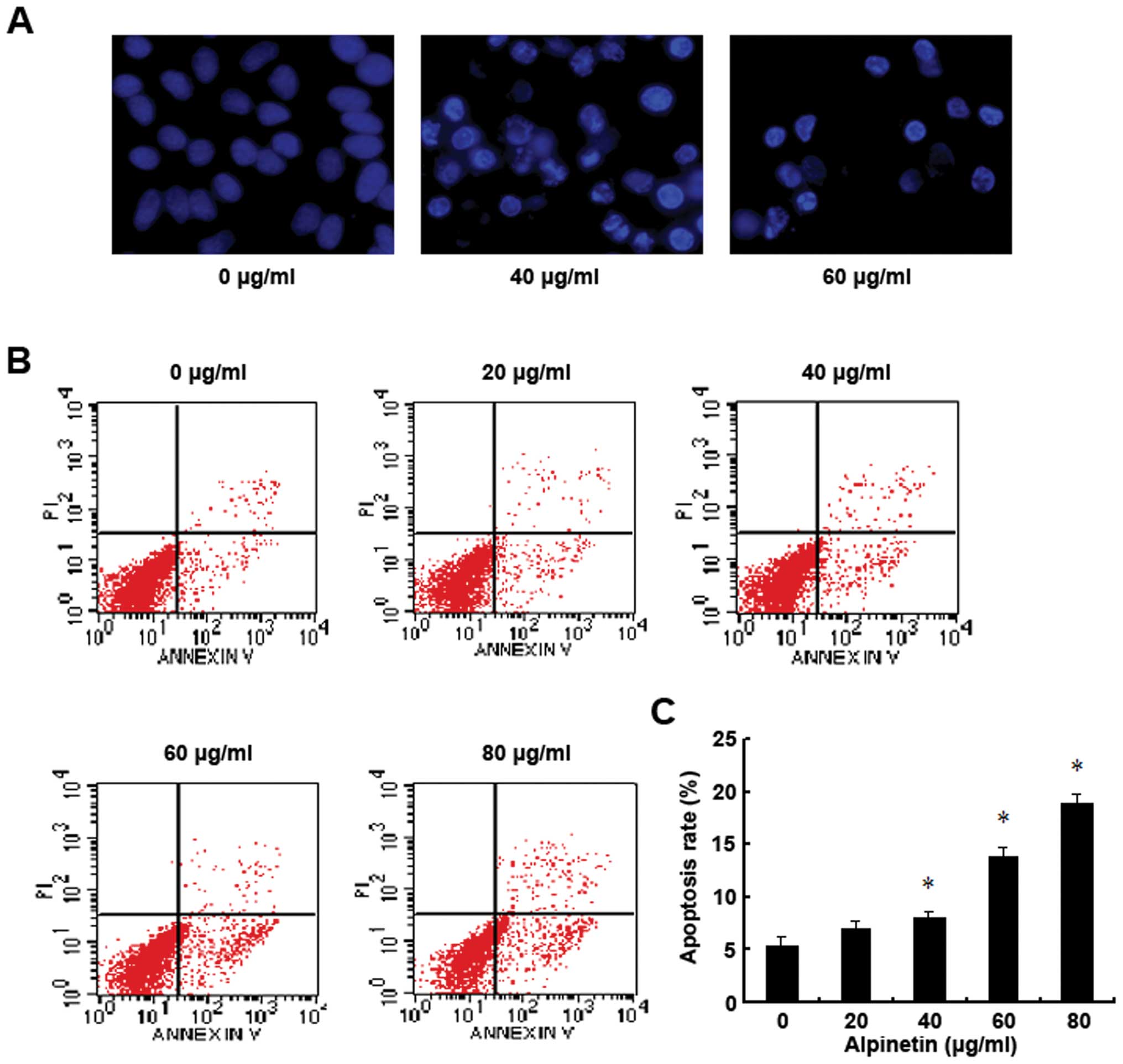 To explore whether the inhibitory effects of alpinetin on pancreatic cancer cells was attributed to the induction of apoptosis, BxPC-3 cells were treated with alpinetin at different doses for 48 h. Then the alpinetin-treated cells were identified using Hoechst 33342 nuclear staining and analyzed by Annexin V-FITC/PI double staining flow cytometry (Fig. 2). As shown in our results, the condensed chromatin of apoptotic cells in the 40 and 60 μg/ml alpinetin-treated groups was significantly brighter than the chromatin of normal cells in the control group (Fig. 2A). Furthermore, alpinetin-treated BxPC-3 cells had notably higher apoptosis rates which were dose-dependent compared to the control group (Fig. 2B and C). These results indicate that alpinetin dose-dependently induced cell apoptosis to inhibit proliferation of pancreatic cancer cells.