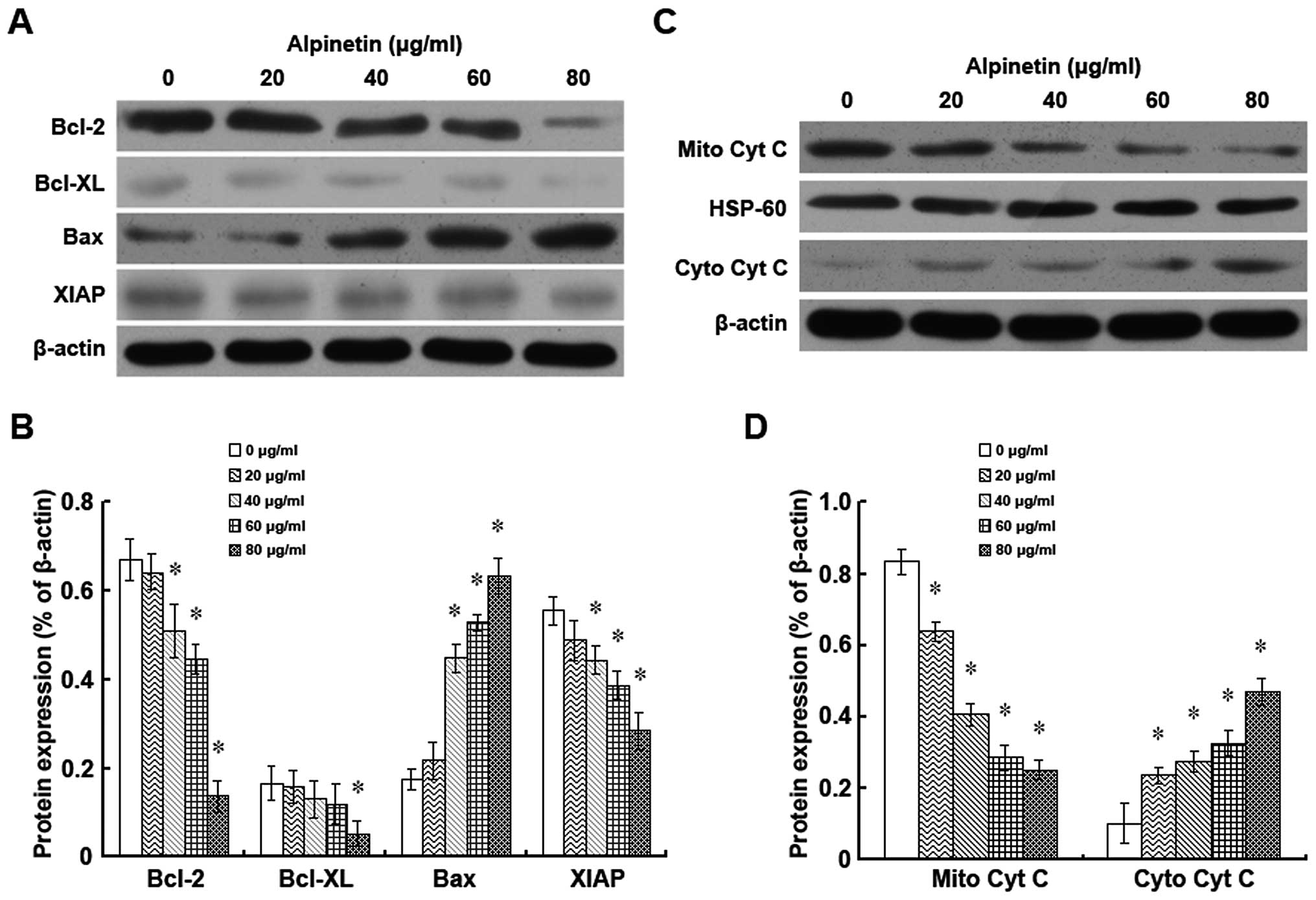 To further study the mechanism involved in alpinetin-induced cell growth inhibition and apoptosis, the changes in the expression of the Bcl-2 family members and XIAP and in the release of cytochrome c were assessed by western blot analysis following treatment with alpinetin for 48 h (Fig. 4). Our data showed that the expression of the anti-apoptotic proteins Bcl-2, Bcl-xL and XIAP in BxPC-3 cells were downregulated by alpinetin in a dose-dependent manner. Conversely, the expression of the pro-apoptotic protein Bax was upregulated in alpinetin-treated BxPC-3 cells (Fig. 4A and B). Also, the expression of cytochrome c in mitochondria was remarkably decreased while a significant increase of cytochrome c protein levels in the cytoplasm was observed after alpinetin treatment (Fig. 4C and D). All these results indicate that alpinetin could activate the mitochondrial apoptotic pathway which could be responsible for its ability to suppress proliferation of BxPC-3 cells.