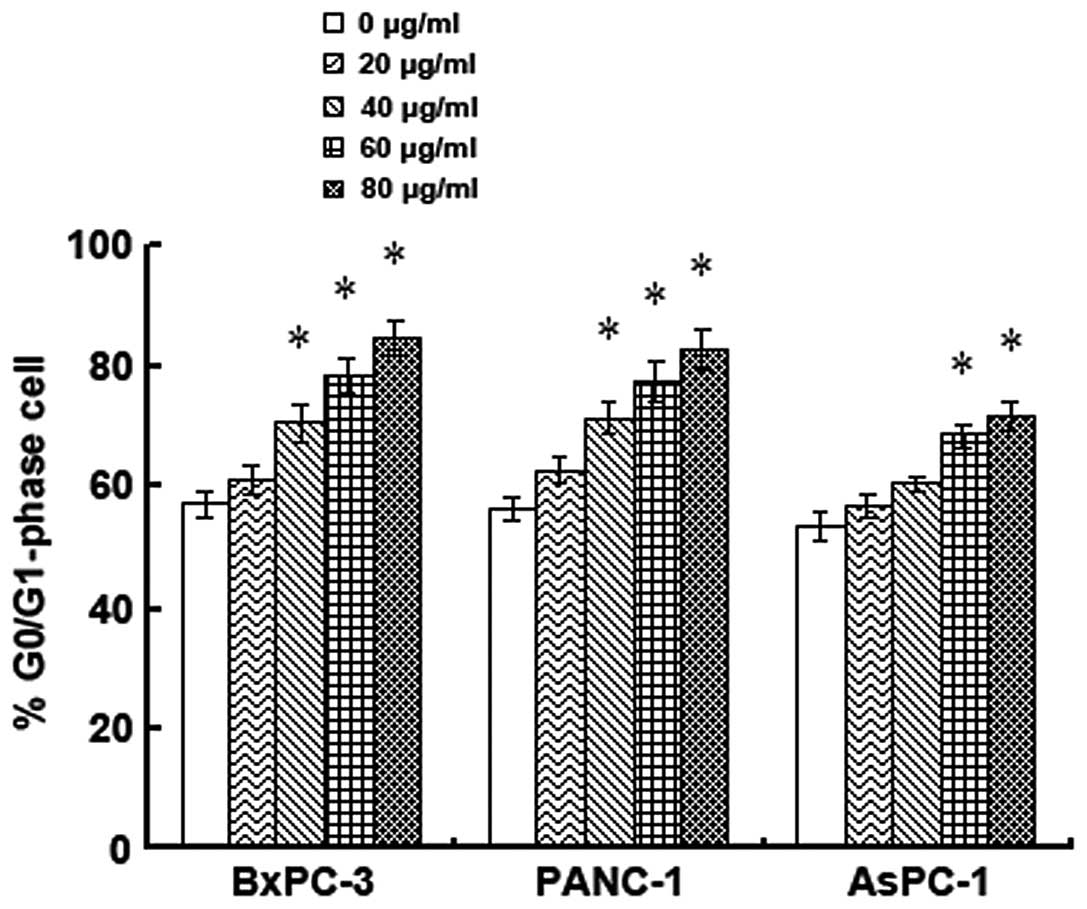 To investigate whether alpinetin could regulate cell cycle phase distribution in human pancreatic cancer cells, cell cycle progression in 3 alpinetin-treated pancreatic cancer cell lines was assessed using flow cytometry. The percentage of different treatment groups in the G0/G1 phase are shown by histograms (Fig. 5). As shown in our results, an arrest in the G0/G1 phase was observed after treatment with 40 μg/ml alpinetin for 48 h in BxPC-3 cells. Meanwhile, the percentage of PANC-1 cells in the G0/G1 phase was also higher in the 40 μg/ml alpinetin-treated group than in the untreated cells. In AsPC-1 cells, alpinetin concentrations of 60 μg/ml and higher caused an arrest in the G0/G1 phase. Our data implies that the anti-proliferation effect induced by alpinetin also possibly occurs through inducing G0/G1 phase arrest.