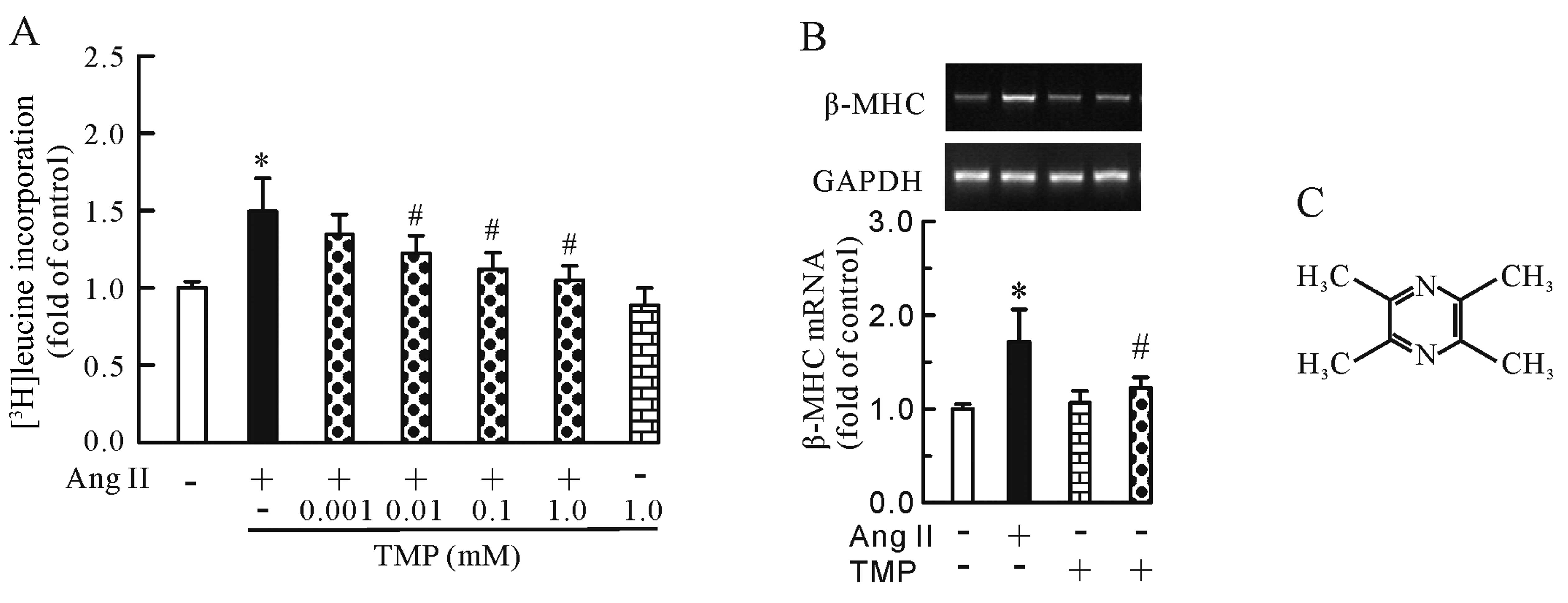 In light of these observations, we hypothesized that TMP inhibits Ang II-induced cardiomyocyte hypertrophy, and that the modulation of the NF-κB pathway, if present, is responsible for the anti-hypertrophic effects of TMP. Furthermore, in this study, we determined whether TMP regulates the Ang II-stimulated secretion and expression of TNF-α in neonatal rat cardiomyocytes.
