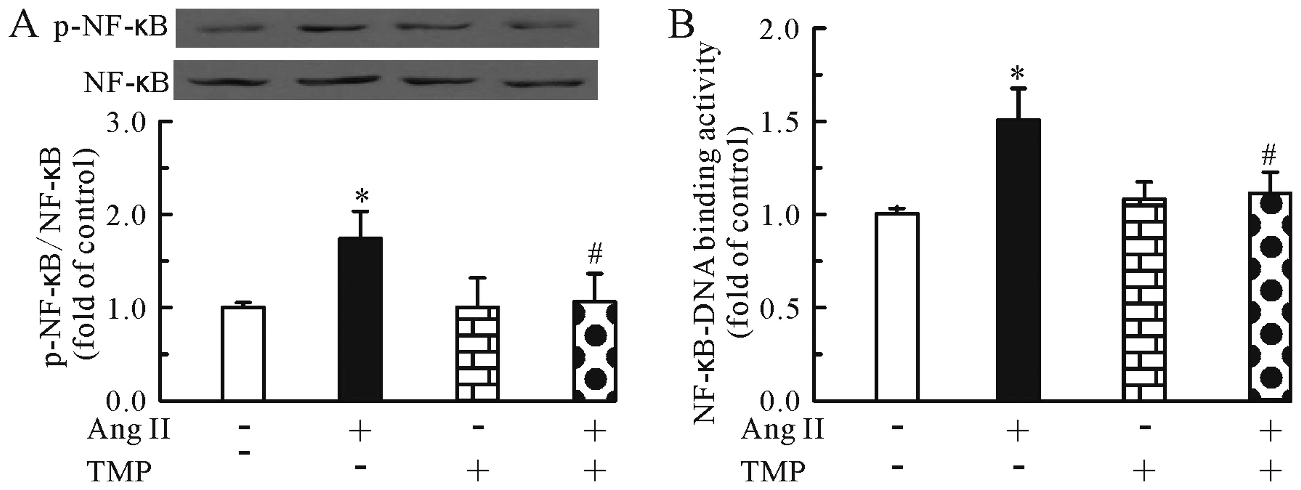 We then investigated whether TMP regulates the Ang II-induced activation of the NF-κB pathway. As shown in Fig. 2, treatment with Ang II for 24 h increased the protein levels of phosphorylated NF-κB p65 (Fig. 2A) and the NF-κB-DNA binding activity (Fig. 2B) in the cardiomyocytes. Conversely, TMP prevented these effects induced by Ang II.