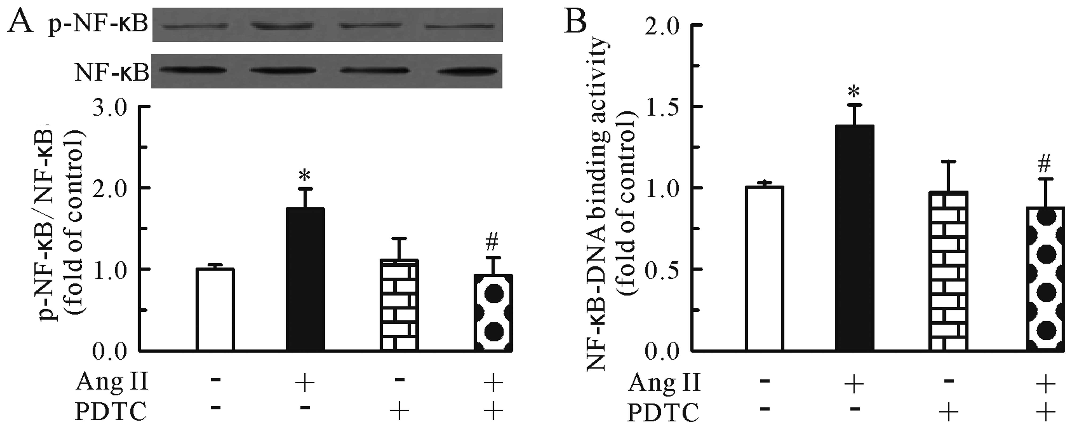 Further experiments revealed the effects of TMP on the mRNA expression and protein secretion of TNF-α. As shown in Fig. 5, Ang II (0.1 μM) increased the mRNA expression (Fig. 5A) and protein secretion of TNF-α (Fig. 5B), whereas TMP (1.0 mM) markedly inhibited these effects induced by Ang II. In addition, we found that compared to treatment with Ang II (0.1 μM) alone, the combined treatment of Ang II and PDTC (100 μM) significantly reduced the mRNA expression (Fig. 6A) and protein secretion (Fig. 6B) of TNF-α. Thus, TMP inhibited the Ang II-induced upregulation of TNF-α mRNA expression and protein secretion through the inhibition of the NF-κB pathway.