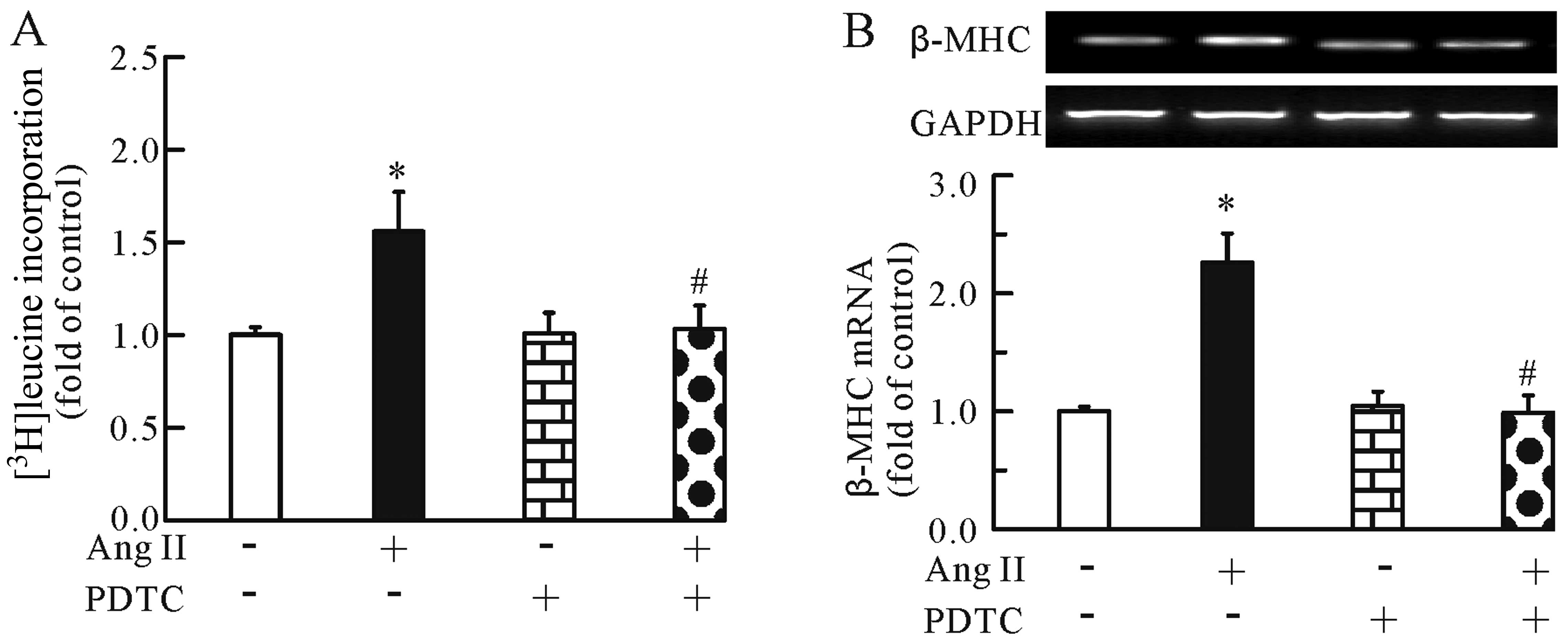 To investigate whether the modulation of NF-κB pathway is responsible for the anti-hypertrophic effects of TMP, the NF-κB inhibitor, PDTC (100 μM), was used in this study. The cardiomyocytes were treated with Ang II (0.1 μM) for 24 h in the presence or absence of PDTC (100 μM). First, we determined the specificity of the inhibitor by western blot analysis. As shown in Fig. 3, the NF-κB inhibitor markedly inhibited the Ang II-induced upregulation of phosphorylated NF-κB p65 (Fig. 3A) and the NF-κB-DNA binding activity (Fig. 3B) in the cardiomyocytes. In addition, the NF-κB inhibitor significantly inhibited the Ang II-induced cardiomyocyte hypertrophy, as evidenced by the decrease in [3H]leucine incorporation (Fig. 4A) and β-MHC mRNA expression (Fig. 4B). Of note, PDTC alone had no effect on [3H]leucine incorporation and β-MHC mRNA expression. Thus, the modulation of the NF-κB pathway may be one of the mechanisms involved in the anti-hypertrophic effects of TMP.