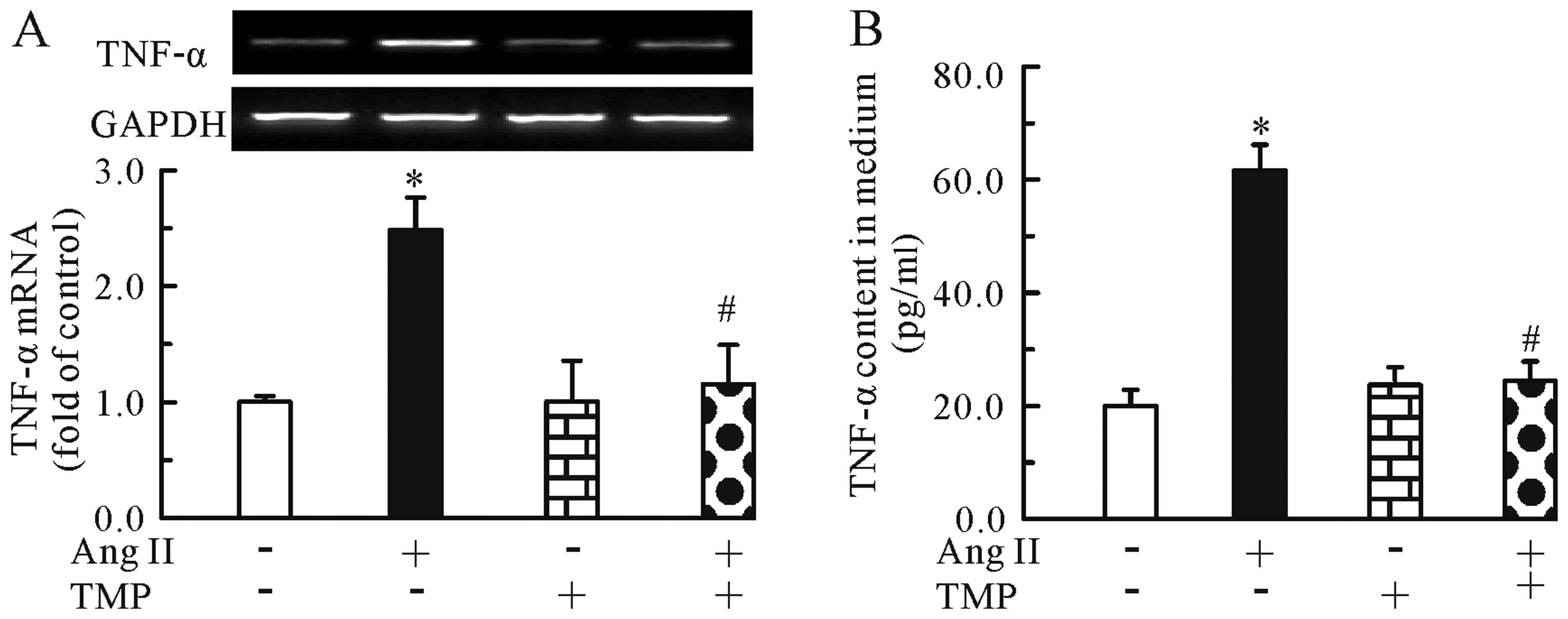 The present study demonstrated that Ang II induced hypertrophic growth in neonatal cardiomyocytes, as evidenced by the increase in [3H]leucine incorporation and β-MHC mRNA expression, which was significantly inhibited by treatment with TMP. Ang II induced NF-κB activation in the cardiomyocytes, whereas TMP decreased the levels of phosphorylated NF-κB. In addition, TMP inhibited the Ang II-stimulated mRNA expression and protein secretion of TNF-α in the cardiomyocytes, which was dependent on NF-κB.