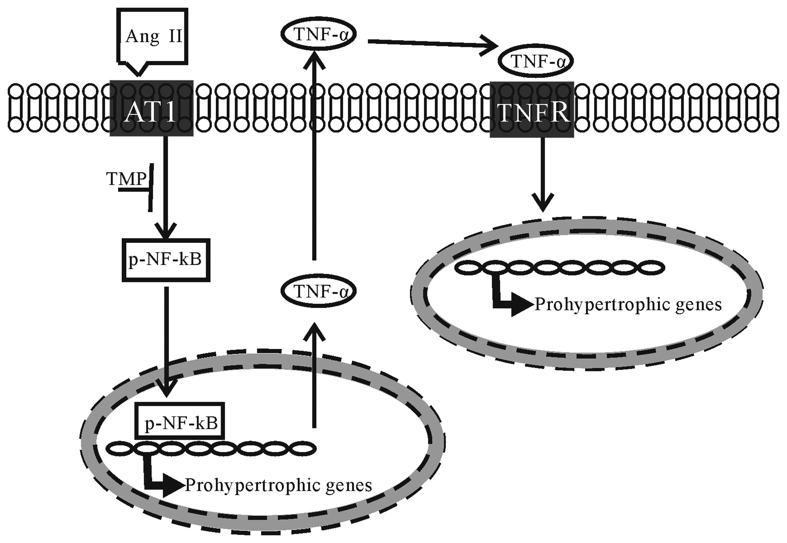In conclusion, the present study investigated the therapeutic effects of TMP on myocardial hypertrophy induced by Ang II. To our knowledge, our results demonstrate for the first time that TMP prevents Ang II-induced hypertrophy in neonatal cardiomyocytes, which is attributed to its inhibition of the NF-κB pathway and TNF-α secretion in cardiomyocytes (the proposed mechanisms underlying the anti-hypertrophic effects of TMP are illustrated in Fig. 7). These findings raise the possibility of developing TMP as a therapeutic drug for cardiac hypertrophy.
