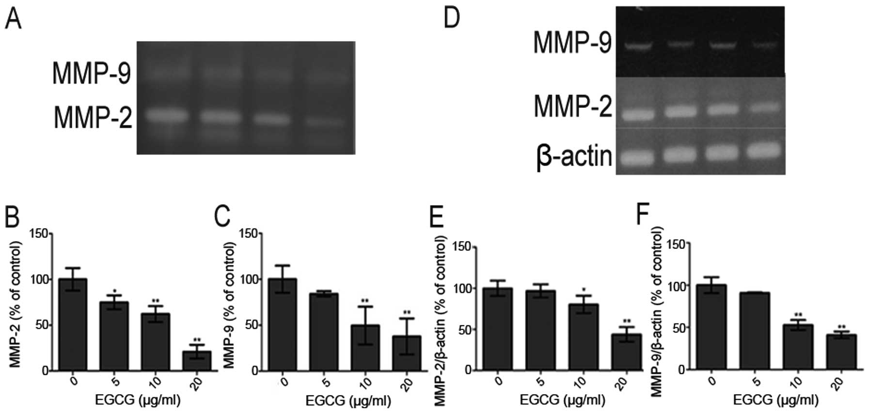 To determine the effects of EGCG on the mRNA levels of MMP-2 and MMP-9 genes, the HCCLM6 cells (1×106 cells/ml) were maintained in culture with or without EGCG for 24 h. Total RNA was isolated for RT-PCR as described above. As shown in Fig. 3D, the mRNA levels of MMP-2 and MMP-9 were downregulated in a dose-dependent manner by EGCG (Fig. 3E and F, respectively).