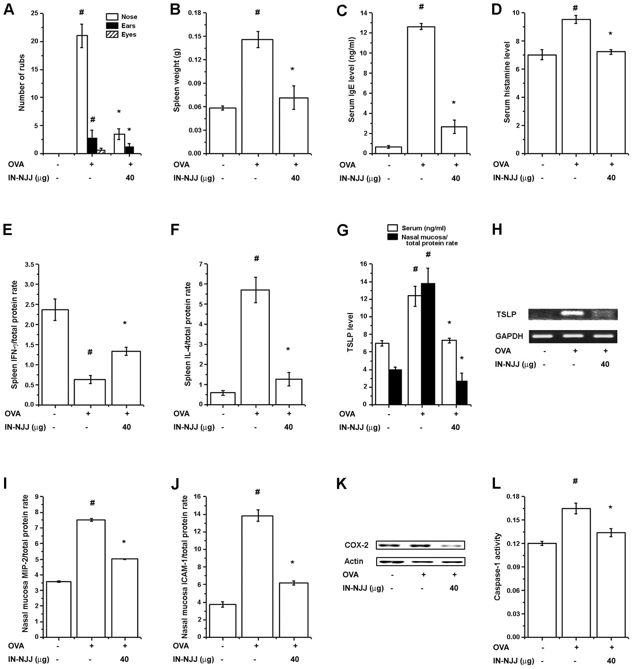 To investigate the effects of the i.n. administration of NJJ (IN-NJJ) on clinical symptoms in mice with AR, IN-NJJ was directly administered into the nasal cavity prior to OVA i.n. challenge for 10 days. The clinical symptoms (spleen weight, serum IgE and histamine levels, IFN-γ levels, ICAM-1 levels) were decreased following IN-NJJ administration (Fig. 6A). The spleen weight was significantly decreased following IN-NJJ administration (Fig. 6B). Serum IgE and histamine levels which were increased by OVA were reduced in the IN-NJJ-administered mice (Fig. 6C and D). As shown in Fig. 6E and F, IN-NJJ administration significantly increased the IFN-γ levels, while decreasing the IL-4 levels compared with the control group. We measured the TSLP levels in the mice with AR. As shown in Fig. 6G, the IN-NJJ-administered mice showed significantly decreased levels of TSLP compared with the untreated mice with AR. TSLP mRNA levels were also significantly decreased following IN-NJJ administration (Fig. 6H). The levels of MIP-2, ICAM-1 and COX-2 in the nasal mucosal tissue were significantly reduced by IN-NJJ administration (Fig. 6I–K). In addition, caspapae-1 activity, which was increased by OVA was decreased following IN-NJJ administration (Fig. 6L).