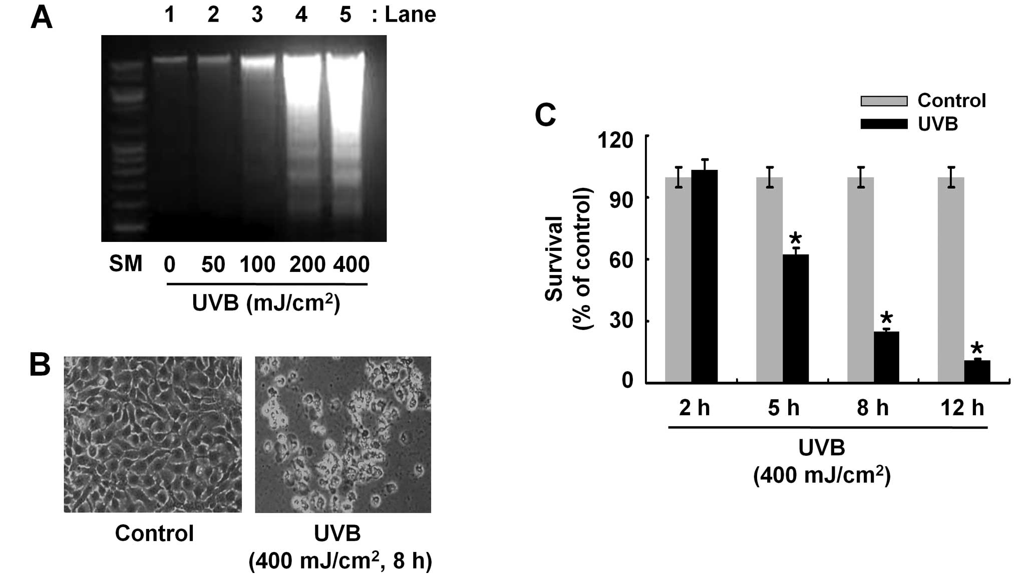 Initially, we investigated whether UVB radiation induces apoptosis of HaCaT cells. In this study, apoptosis induction by UVB was assessed by the ability of UVB to induce genomic DNA fragmentation, an index of apoptosis in HaCaT cells. There was no DNA fragmentation in HaCaT cells exposed to UVB radiation at 50 or 100 mJ/cm2 for 8 h (lanes 2 or 3) (Fig. 1A). However, there was strong induction of DNA fragmentation in HaCaT cells exposed to UVB at 200 or 400 mJ/cm2 (lanes 4 or 5). Cells undergoing apoptosis have distinct morphological changes, such as cell shrinkage. Compared with the control, UVB (400 mJ/cm2, 8 h) radiation induced severe cell shrinkage of HaCaT cells, supporting the apoptosis-inducing effects of UVB on HaCaT cells (Fig. 1B). Using 400 mJ/cm2, time course experiments were conducted to determine the effect of UVB (400 mJ/cm2) radiation on survival of HaCaT cells over time. Data of cell count analysis demonstrated ~47, 73 and 90% reduction of HaCaT cell survival by UVB radiation at 5, 8 and 12 h, respectively (Fig. 1C). These results collectively suggest that UVB radiation at 400 mJ/cm2 for 8 h has strong anti-survival and pro-apoptotic effects on HaCaT cells.