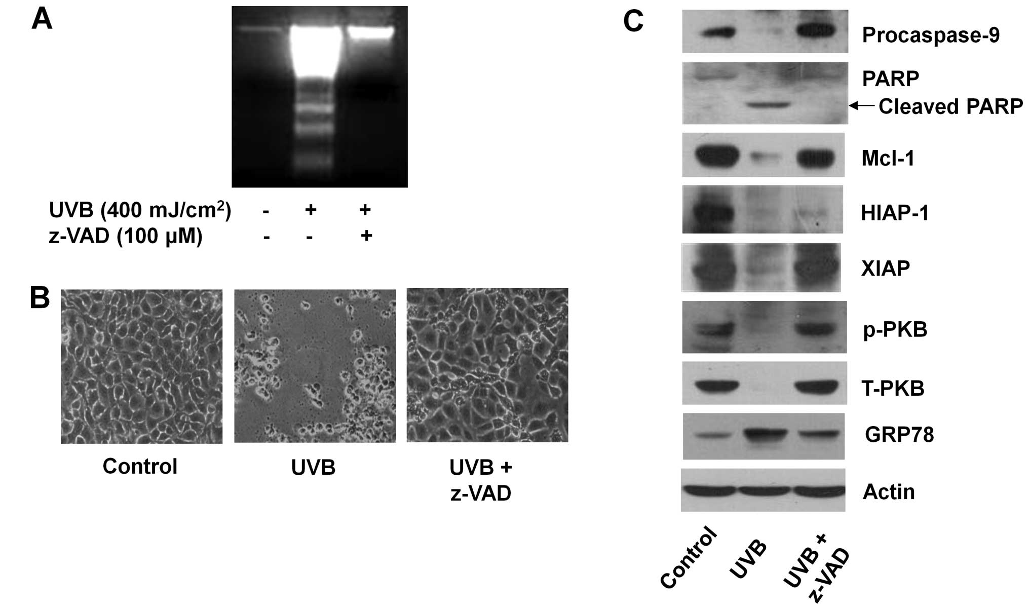 Involvement of caspases in the UVB-induced apoptosis of HaCaT cells was determined using z-VAD-fmk, a broad-spectrum caspase inhibitor. The UVB-induced apoptosis in HaCaT cells (lane 2) was strongly blunted by the caspase inhibitor (lane 3) (Fig. 4A). The UVB-induced morphological changes (cell shrinkage) of HaCaT cells were also largely blocked by z-VAD-fmk (Fig. 4B). Notably, the UVB-induced activation of caspase-9 and production of cleaved PARP in HaCaT cells (lane 2) was not shown in the presence of z-VAD-fmk (lane 3), suggesting the drug efficacy to inhibit the caspase pathway (Fig. 4C). Of note, the UVB-induced downregulation of Mcl-1 and XIAP, but not HIAP-1, in HaCaT cells (lane 2) was strongly blocked by z-VAD-fmk (lane 3). Furthermore, the UVB-induced downregulation of phosphorylated and total PKB proteins in HaCaT cells (lane 2) was largely inhibited by z-VAD-fmk (lane 3). Actin protein expression remained unchanged under these experimental conditions (Fig. 4C).