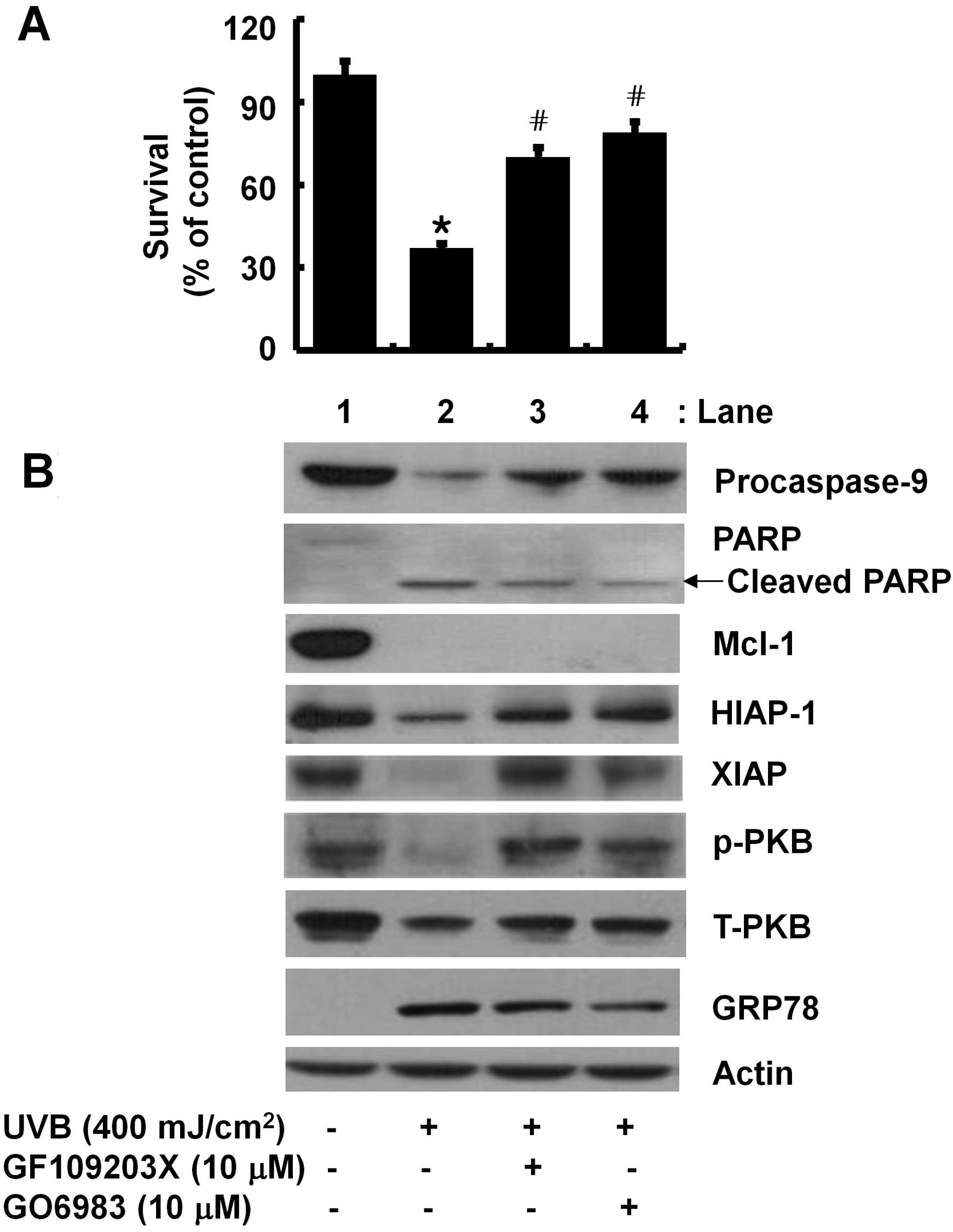 PKCs are involved in cell survival and/or apoptosis of keratinocytes exposed to UVB. Using GF109203X or GO6983, a broad-spectrum of PKC inhibitor, we determined whether activities of PKCs are linked to the UVB-induced anti-survival and/or pro-apoptotic responses in HaCaT cells. The anti-survival effect of UVB on HaCaT cells (column 2) was largely blocked in the presence of GF109203X (column 3) or GO6983 (column 4) (Fig. 5A). Notably, the UVB effects on activation of caspase-9, cleavage of PARP, downregulation of HIAP-1, XIAP and PKB in HaCaT cells (lane 2) was partially or largely blunted by GF109203X (lane 3) or GO6983 (lane 4) (Fig. 5B). The UVB-induced downregulation of Mcl-1 (lane 2) was not changed by each PKC inhibitor (lanes 3 or 4). Actin protein expression remained constant by treatment with or without UVB in the absence or presence of GF109203X or GO6983 (Fig. 5B).