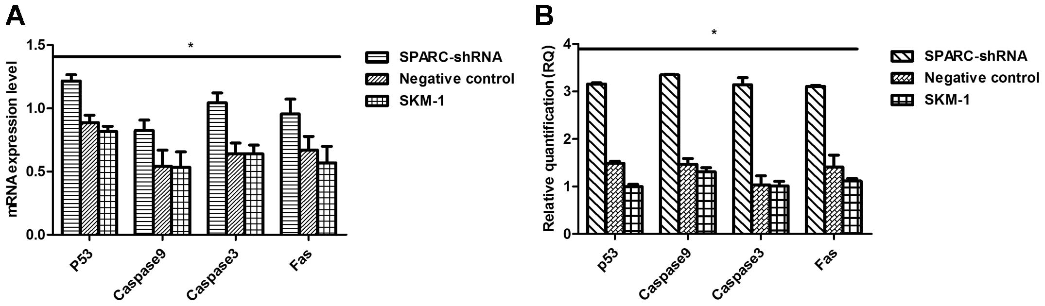 In order to better understand the function of SPARC in SKM-1 cells, we analyzed cell proliferation and apoptosis. By MTS assay, knockdown of SPARC suppressed MDS/AML cell proliferation. Flow cytometric analysis indicated that knockdown of SPARC increased the number of cells in the G1/G0 phase, while decreasing the number of cells in the S phase, revealing G1/G0 phase arrest. In addition, we found increased apoptosis in the MDS/AML cells after knockdown of SPARC. SPARC is a potential tumor-suppressor gene in 5q- syndrome, and is thought to have anti-adhesive effects, thereby promoting apoptosis. It also regulates cellular migration and proliferation. Based on the results of the MTS assay and flow cytometry in our study, decreased expression of SPARC pointed to a contrary conclusion. SPARC was found to be differentially expressed in tumors and its surrounding stroma in various types of cancers in comparison to normal tissue. To understand the mechanism of SPARC in the proliferation and apoptosis of transformed MDS/AML, we detected the expression of p53, caspase-3, caspase-9 and Fas in the SPARC shRNA-infected cells and in the other groups.