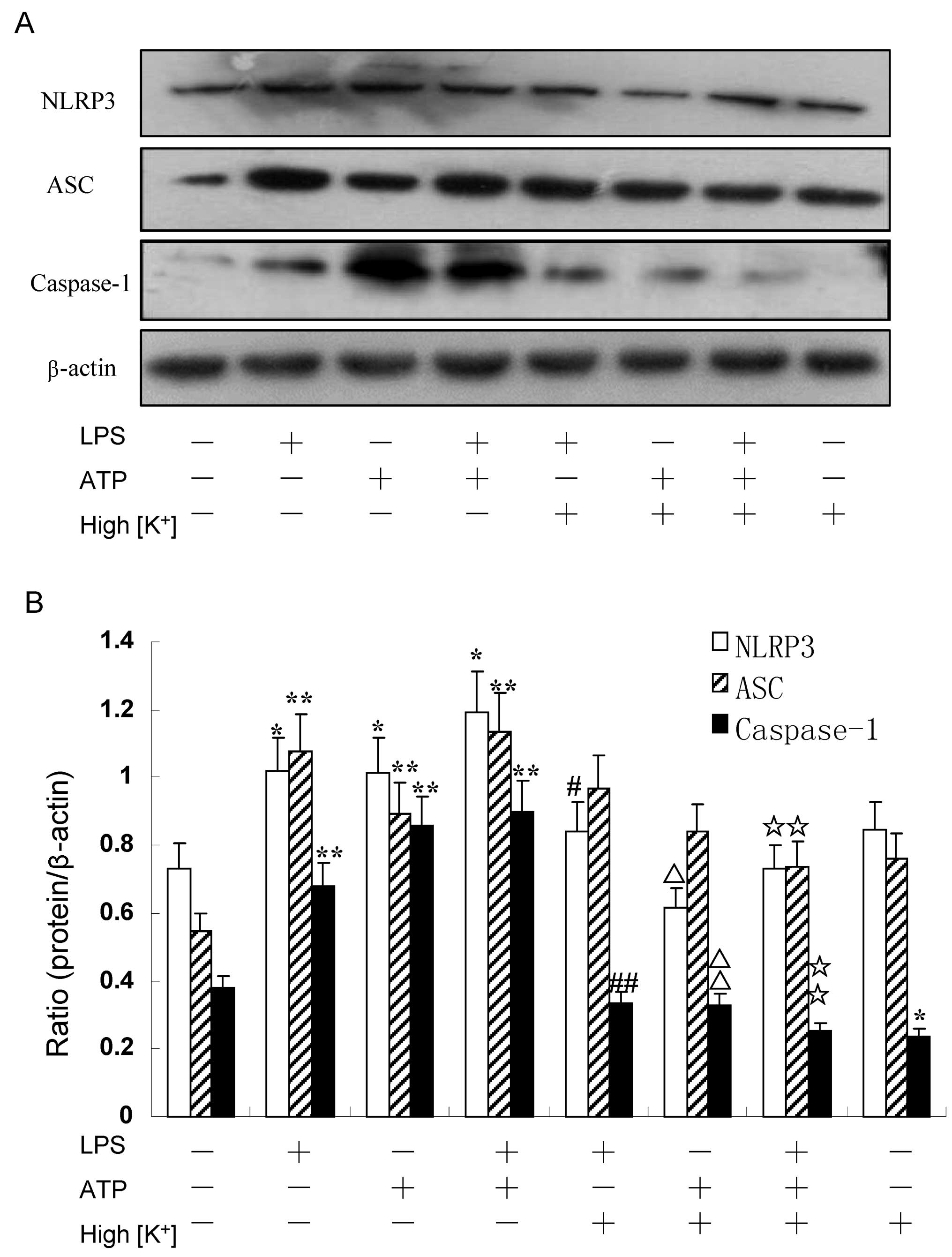 Pétrilli V, Papin S, Dostert C, Mayor A, Martinon F and Tschopp J: Activation of the NALP3 inflammasome is triggered by low intracellular potassium concentration. Cell Death Differ. 14:1583–1589. 2007.PubMed/NCBI | |