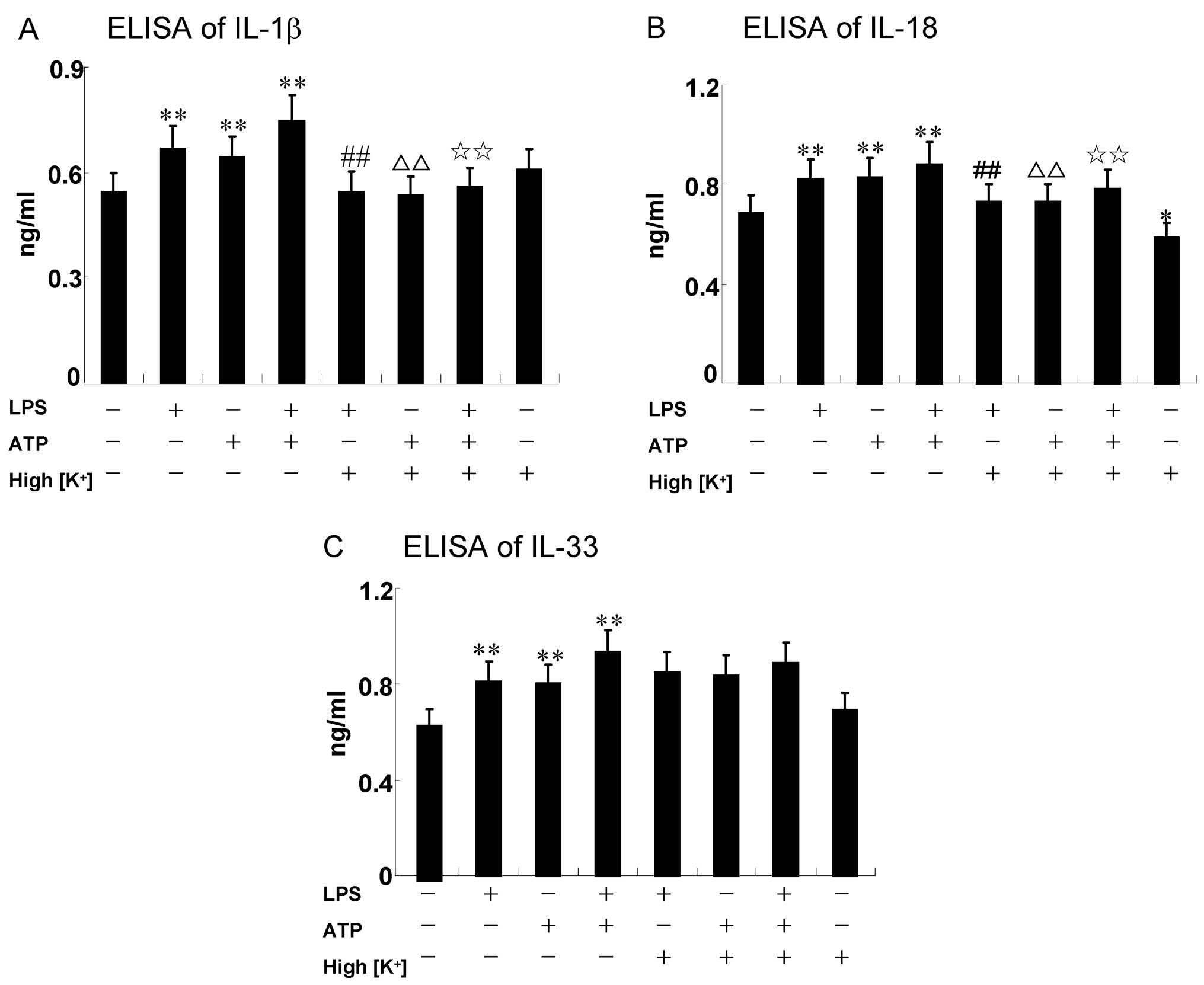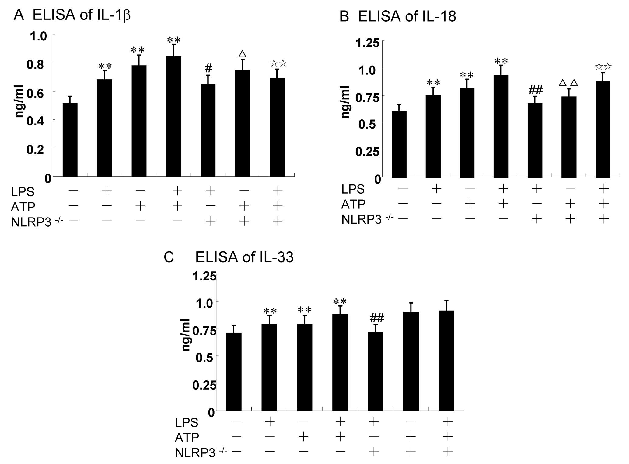 The RAW264.7 cells (2×106 cells/well) were seeded in a 6-well-plate, and the cells are treated as indicated. IL-1β, IL-18 and IL-33 levels in the cell supernatants were measured using ELISA kits according to the manufacturer’s instructions.