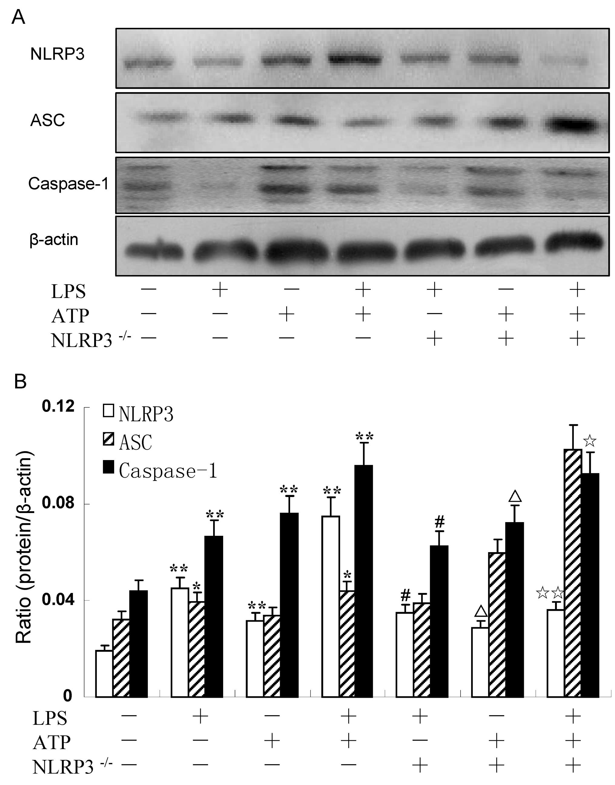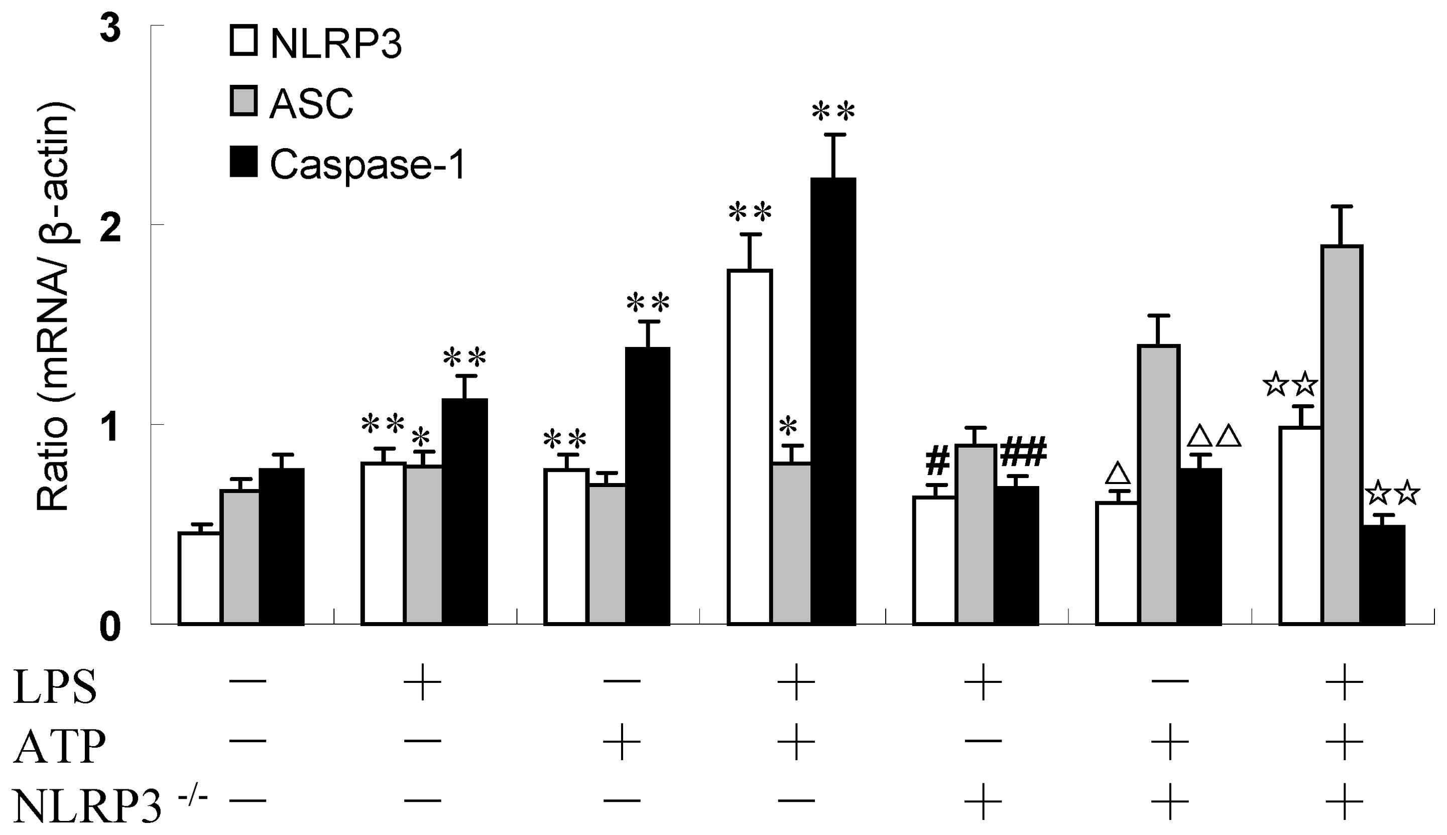 Innate immunity offers the first defense in mammals, depending on its capacity to rapidly detect invading pathogens and then eliminating the ‘foreign danger’ (1). However, innate immunity is also involved in the development of inflammatory responses that occur in a sterile milieu (2). Inflammasomes are intracellular multiprotein complexes that regulate the activity of caspase-1 and can be activated by various cellular dangers that trigger the processing and release of pro-inflammatory cytokines to engage innate immunity (3). Nucleotide-binding oligomerization domain (NOD)-like receptors (NLRs) have recently been identified as innate immune receptors that play a pivotal role in initiating the inflammatory response (4). The NLR family, pyrin domain-containing 3 (NLRP3) inflammasome is currently one of the most fully characterized inflammasomes. The NLRP3 inflammasome consists of the NLRP3 scaffold, the apoptosis-associated speck-like protein containing a caspase recruitment domain (CARD) (ASC) adaptor and caspase-1 (5,6). The NLRP3 inflammasome is activated in response to a variety of signals that include pathogen-associated molecular patterns (PAMPs) or danger-associated molecular patterns (DAMPs) (6). The NLRP3 inflammasome is a multiprotein complex that activates cysteine protease caspase-1, which leads to the maturation and secretion of pro-inflammatory cytokines, such as interleukin-1β (IL)-1β and IL-18 (7).