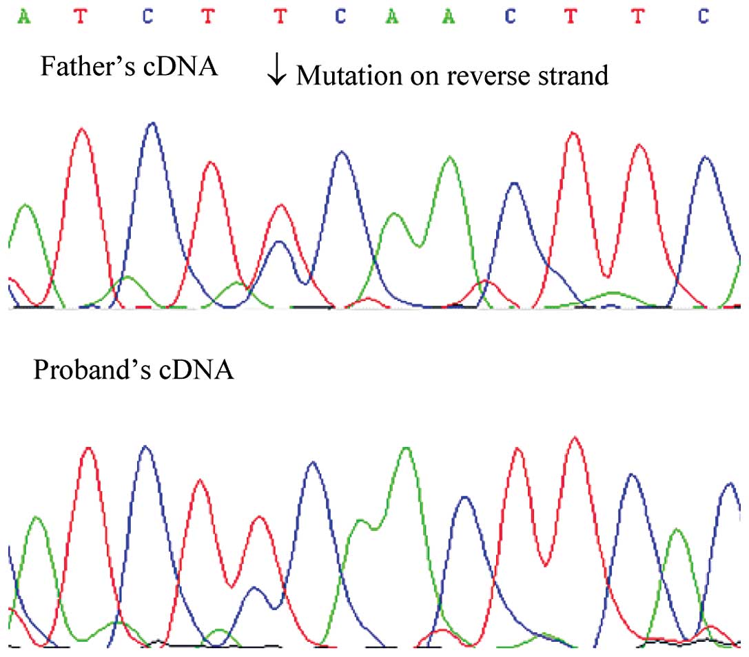 Of note, one exonic mutation, c.3362A>G, produced mosaicism of E1121G and exon 20 skipping at the mRNA level (Fig. 1). This germline mutation in the proband was inherited from his father, and the post-transcriptional mosaicism was presented in the mRNA of both patients. However, the missense mutation of the son showed a lower signal intensity using Sanger sequencing (Fig. 2). The mosaicism of the post-transcriptional profile was further examined using real-time PCR with cDNA obtained from this family (Fig. 3). The sample from the mother was used as the wild-type sample in this assay. The skipping rate of the mutant exon in the samplefrom the son was higher compared to the rate in the sample from the father.
