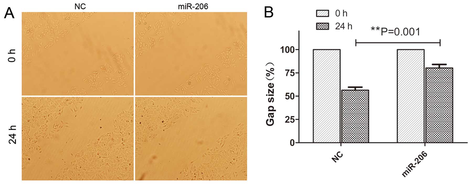 Cellular migration is an essential process in cancer metastasis. Thus, we examined the cellular migration ability in order to explore the potential role of miR-206 in HCC cell metastasis. The wound healing assay revealed that the cells transfected with miR-206 healed the wound more slowly than the NC-transfected cells (Fig. 8). MMPs may be associated with the impaired migtation of miR-206-transfected cells. To examine this hypothesis, we detected MMP-9 expression at the mRNA and protein level. Consistent with the results of migration assay, the overexpression of miR-206 caused a significant reduction in MMP-9 expression at the mRNA and protein level (Figs. 3B and 6); the protein expression level of cleaved MMP-9 (MMP-9 CL) in particular was downregulated in the HepG2 cells. Our results indicate that one of the possible mechanims responsible for the inhibitory effects of miR-206 on the migration of HepG2 cells is through the Notch3-MMP-9 pathway, at least through the downregulation of MMP-9.