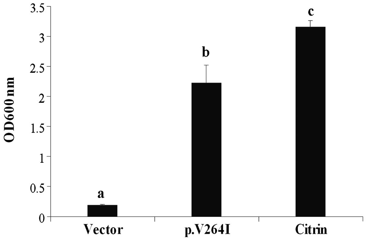 As illustrated in Fig. 5, the growth ability of the BYagc1Δ yeast transformed with the mutant plasmid (p.V264I) was significantly reduced (P<0.01) in comparison with that transformed with the plasmid pYX212-citrin (citrin). However, when compared with the empty plasmid group (vector), the growth ability in the mutant group (p.V264I) was still higher (P<0.01). These findings indicated that the p.V264I mutation reduced, but did not eliminate the AGC2 function of citrin protein.