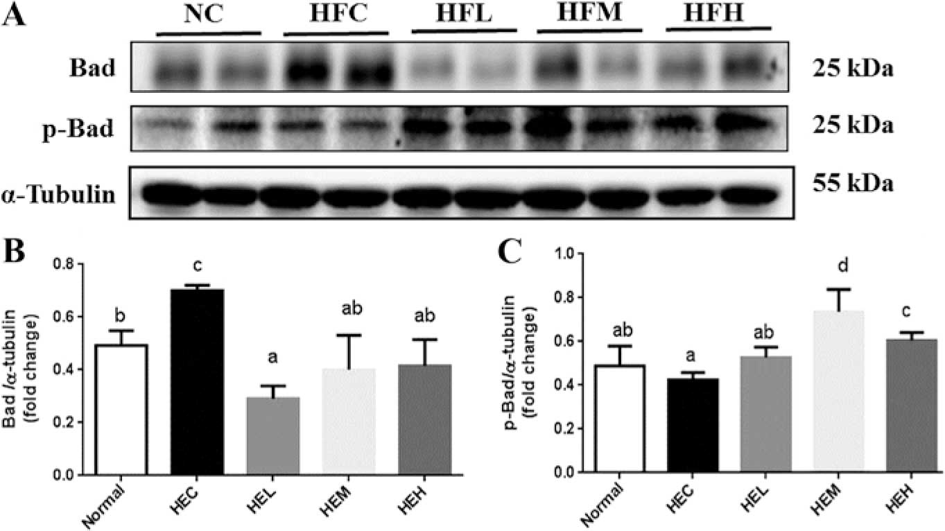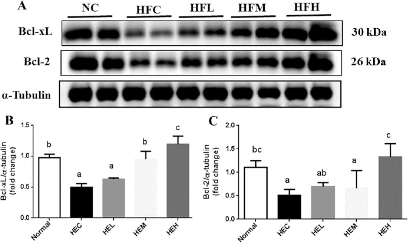 The mitochondria-dependent apoptotic pathway is tightly controlled by the Bcl-2 protein family. Pro-apoptotic and anti-apoptotic members of the Bcl-2 family appear to interact with and neutralize one another such that the relative balance of these effectors strongly influences cell fate (32). Shifting the balance of Bcl-2 family members towards pro-apoptotic factors leads to activated caspase-9, which subsequently activates caspase-3 and leads to execution of the apoptotic program (33). In the present study, probiotics were found to significantly inhibit increases in activated pro-apoptotic members of the Bcl-2 family observed for the HFC group. This activity was indicated by decreased levels of obesity upregulated t-Bid with medium, and particularly high probiotic supplementation. Probiotic supplementation also significantly increased the levels of anti-apoptotic components as evidenced by elevated Bcl-xL, Bcl-2 and p-Bad levels, thus decreasing activated caspase-3 levels in HF-fed rats. Therefore, the present results strongly suggest that oral administration of probiotics may prevent activation of cardiac apoptotic pathways for HF-fed rats.