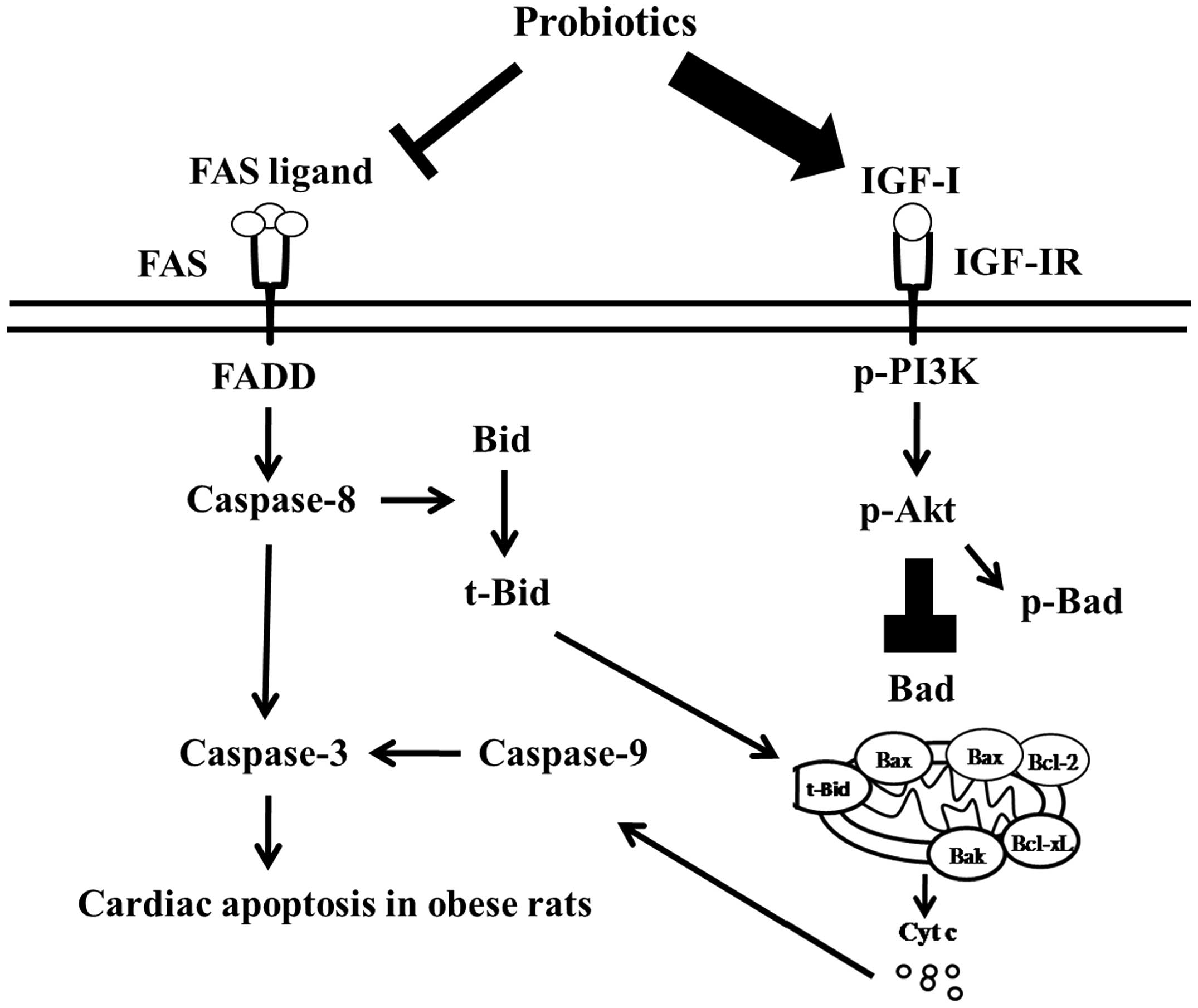The major findings of the present study can be summarized in four main points. i) The body fat and plasma lipids of HF rats were lower in response to probiotic administration. ii) The myocardial architecture in HF rats was improved with probiotic administration. iii) The two major apoptotic pathways in obese hearts were significantly suppressed in response to dietary probiotic supplementation, and this suppression was indicated by decreased expression of Fas receptor- (Fas receptor, FADD and activated caspase-8) and mitochondria-dependent apoptotic proteins (t-Bid, Bad and activated caspase-9 and caspase-3) for the HFC group compared to the NC group. iv) By contrast, the levels of the anti-apoptotic proteins BcL-2, Bcl-xL and p-Bad were increased in hearts from the HFL, HFM and HFH groups compared to the HFC group. The survival pathway activity in obese hearts was significantly increased in response to dietary probiotic supplementation; this change was indicated by increases in p-IGF1R, p-PI3K and p-Akt in the HFL, HFM and HFH groups compared to the HFC group. Following integration of the current findings into the previously proposed apoptotic theories, a proposed mechanism (Fig. 8) was developed suggesting that cardiac Fas receptor- and mitochondria-dependent pathways are activated in obese rats and can be suppressed by dietary probiotic supplementation. By contrast, cardiac survival components are decreased in obesity and their expression can be enhanced by probiotic supplementation to the point of restoration. The present findings demonstrate novel therapeutic uses for probiotics in preventing apoptosis and enhancing survival in hearts of obese rats.