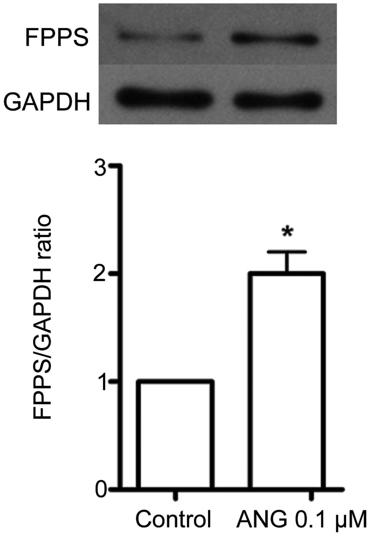 In the growth-arrested VSMCs, incubation with Ang II (0.1 μM) for 24 h increased the protein expression of FPPS (P<0.05; Fig. 1).