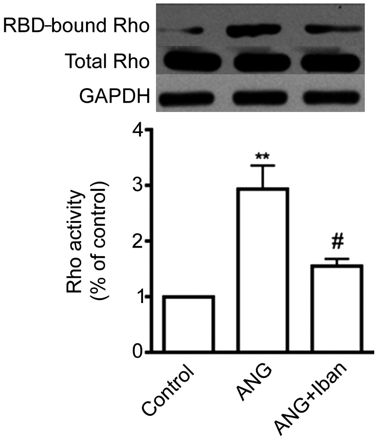 Stimulation with 0.1 μM Ang II for 15 min increased the GTP-bound RhoA levels, as shown by pull-down assays (Fig. 4), which is in accordance with the findings of a previous study (7). We then wished to determine whether Iban inhibits the activation of RhoA induced by Ang II. Pre-treatment with 10 μM Iban for 24 h diminished the Ang II-induced activation of RhoA, as shown by pull-down assays (Fig. 4). These data demonstrate that Iban inhibits RhoA activation induced by Ang II.