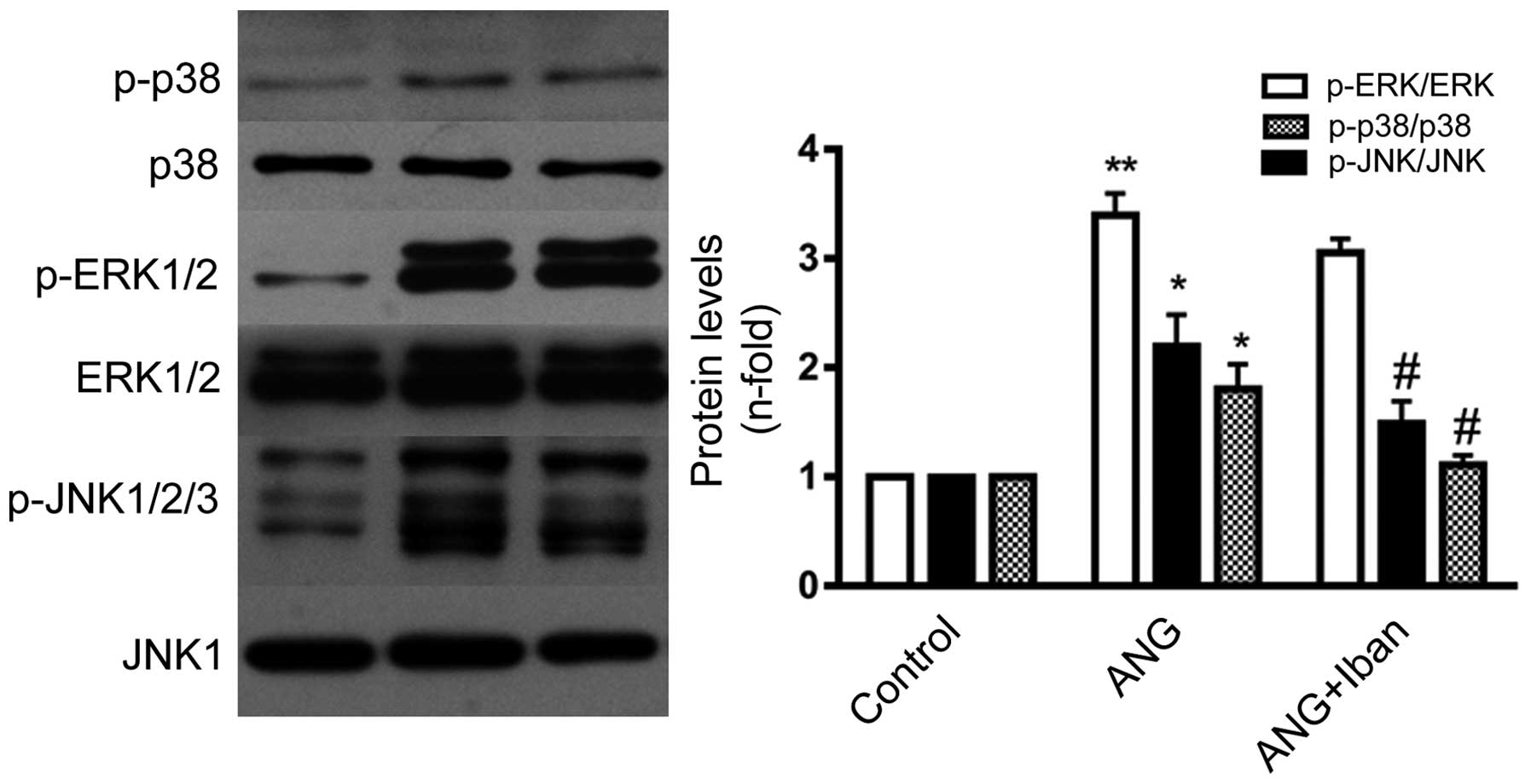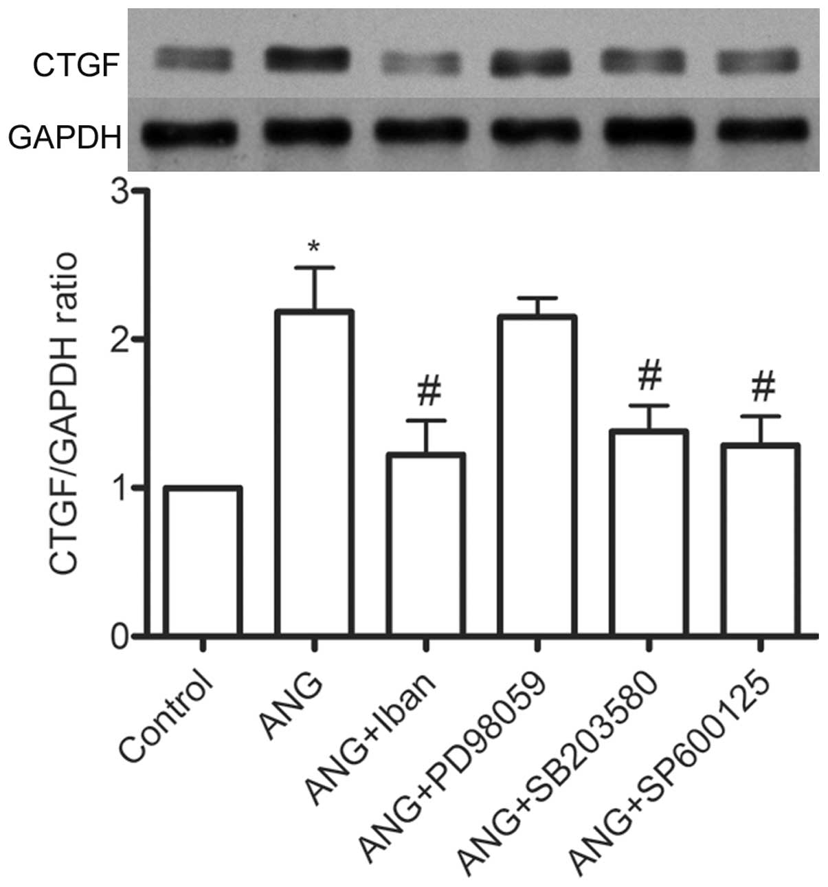 It is well known that MAPKs are a widely distributed group of enzymes. The consisting of 3 isoforms (ERK, p38 and JNK) and play an important role in Ang II-mediated vascular remodeling (7,8,31). To determine whether Iban modulates the Ang II-induced overexpression of CTGF by altering the activity of the MAPK pathway, VSMCs were pre-treated with the specific inhibitor of the MAPK pathway prior to stimulation with Ang II. As shown in Fig. 5, both the JNK and p38 MAPK inhibitor diminished the Ang II-induced production of CTGF. This is consistent with the findings of a pregvious study on the effects of HMG-CoA reductase inhibitors (statins) on the modulation of Ang II-mediated vascular responses (7). Furthermore, as previously described (7) and shown in Fig. 6 in the present study, treatment with Ang II triggered the phosphorylation of all 3 MAPKs. However, only the phosphorylation of JNK and p38 was diminished by treatment with Iban. These data indicate that JNK and p38 MAPK may be involved in the Iban-mediated inhibition of CTGF overexpression induced by Ang II in VSMCs.