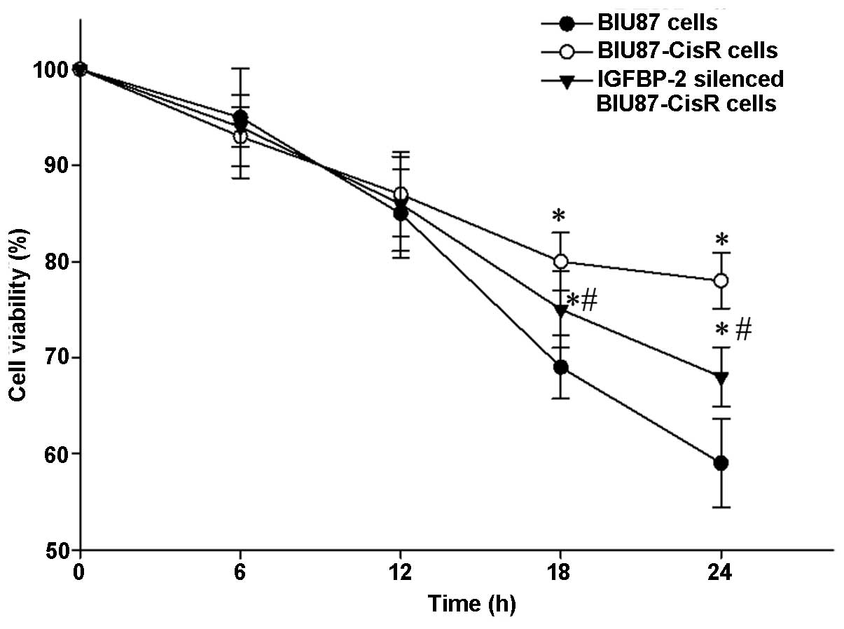 Cisplatin (3 μM) treatment was observed to induce cell death in a time-dependent manner (Fig. 9). Following 24 h cisplatin exposure, the cell viability was significantly lower in the BIU87 cells (P<0.05), compared with the BIU87-CisR cells and IGFBP-2 silenced BIU87-CisR cells. The normal BIU87 cells were the most sensitive to cisplatin, and the BIU87-CisR cells exhibited significant resistance to cisplatin, compared with the normal BIU87 cells. However, the IGFBP-2-silenced BIU87-CisR cells were more sensitive to cisplatin, compared with the BIU87-CisR cells without siRNA treatment.