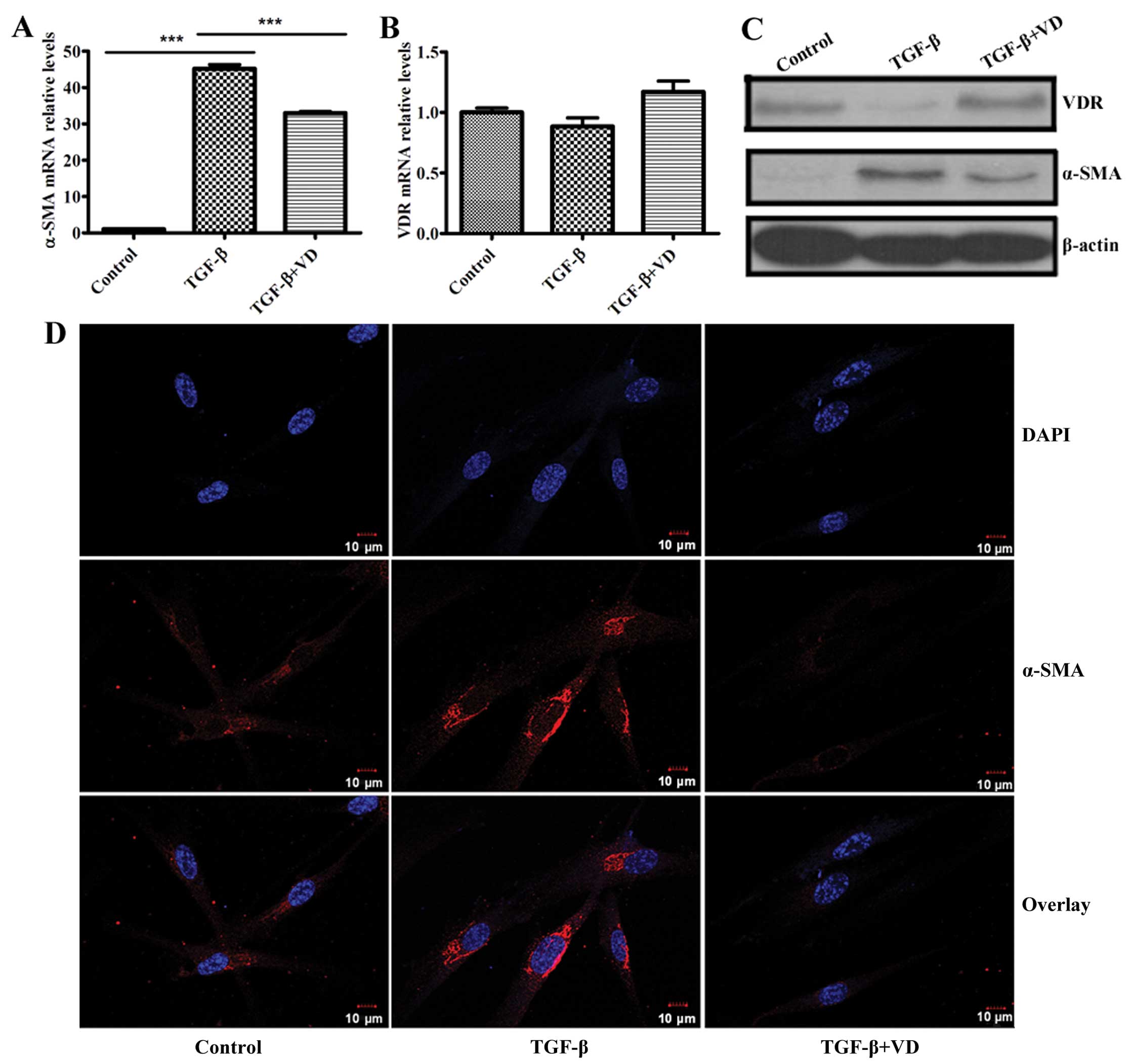 Total RNA was extracted using TRIzol reagent (Invitrogen, Carlsbad, CA, USA), according to the manufacturer's instructions. cDNA was generated from total RNA using PrimeScript RT Master mix (5X) (Takara, Dalian, China), according to the manufacturing instructions. To quantify mRNA expression, SYBR Premix Ex Taq (2X) (Takara) was used. The qPCR thermal cycling protocol was programmed in the CFX96™ Real-Time PCR Detection system (Bio-Rad, Hercules, CA, USA) and consisted of an initial denaturation step at 95°C for 30 sec, followed by 40 cycles of denaturation for 5 sec at 95°C, and annealing and extension for 30 sec at 60°C. A primer pair for the detection of human β-actin was used as the internal control. RT-qPCR primers were based on GenBank published sequences and were as follows: α-SMA sense, 5′-GGC GGT GCT GTC TCT CTA TG-3′ and antisense, 5′-CCC ATC AGG CAA CTC GTA AC-3′; VDR sense, 5′-GGC CGG ACC AGA AGC CTT T-3′ and antisense, 5′-CAG CCT TCA CAG GTC ATA GCA-3′; β-actin sense, 5′-ACT GGA ACG GTG AAG GTG AC-3′ antisense, 5′-GGC ACG AAG GCT CAT CAT-3′.