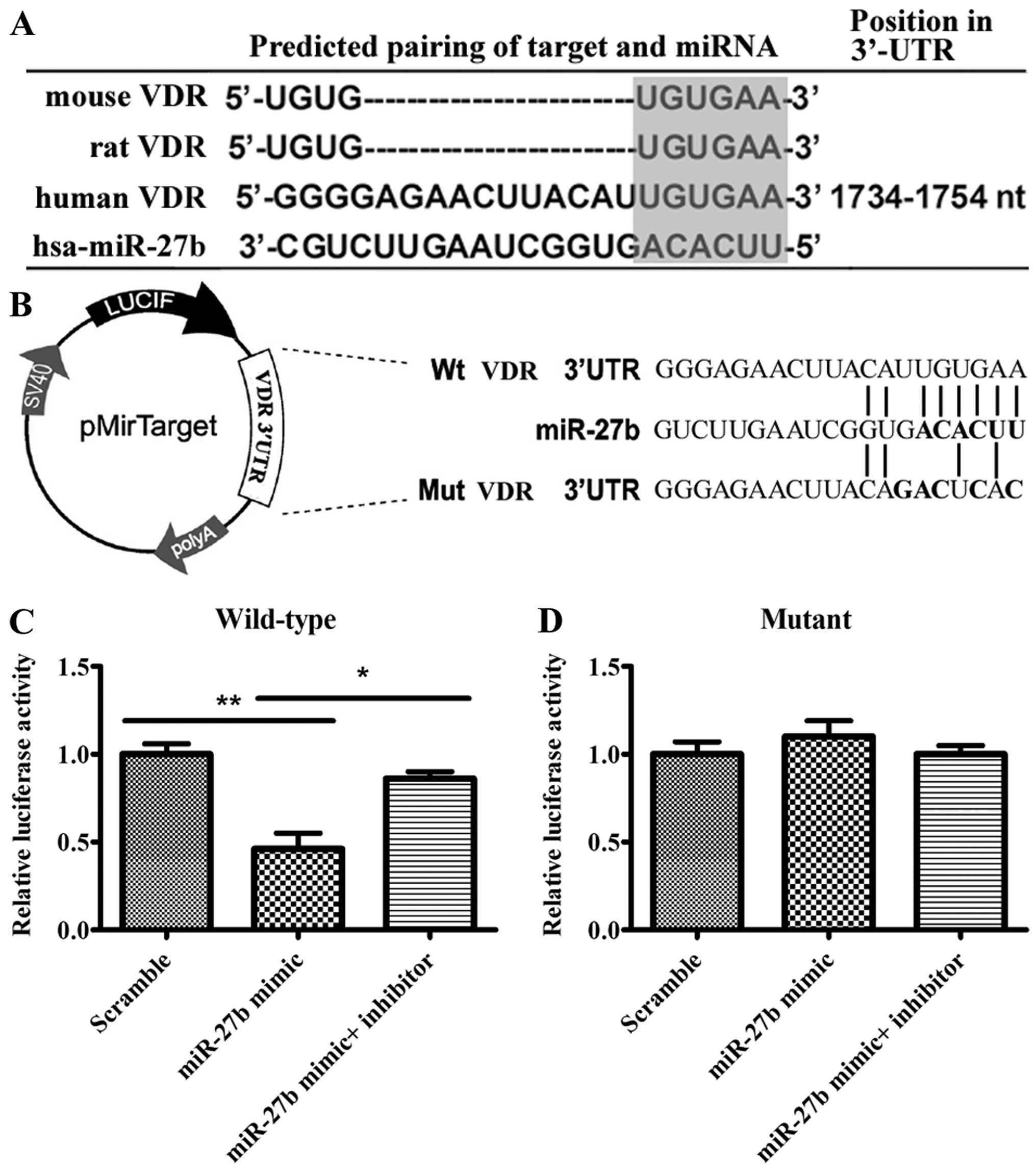 A synthetic oligonucleotide was inserted at the 3′UTR region of the luciferase reporter gene of the pMIR-target vector. The wild-type and mutant 3′UTR of the VDR genes were amplified by PCR and subcloned in the pMIR-target vectors. The constructs were co-transfected into 293A cells along with scramble (50 nM), miR-27b mimic (50 nM) or miR-27b inhibitor (100 nM) using Lipofectamine 2000, according to the manufacturer's instructions. Luciferase activities were measured with the Dual Luciferase Reporter Assay system (Promega, Madison, WI, USA) 48 h after transfection.