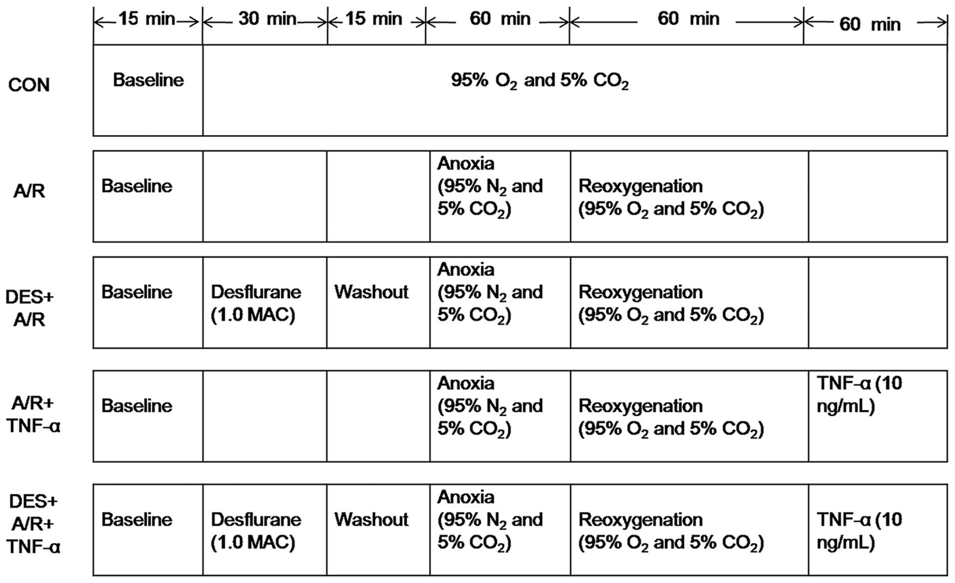 An in vitro model of A/R, which has been previously described (49), was used in the present study. The HUVECs were subjected to a period of anoxia, during which the cells were incubated in 95% N2 and 5% CO2 for 60 min, followed by 60 min reoxygenation, during which time the cells were incubated in 95% O2 and 5% CO2. Prior to exposure to A/R, the cells were incubated in the presence or absence of desflurane (1.0 MAC) for 30 min, and then allowed to rest for 15 min. Immediately after the A/R protocol, the cells were incubated in the presence or absence of 10 ng/ml recombitant human TNF-α (rhTNF-α) (ProSpec, Ness Ziona, Israel) for 60 min (Fig. 2).