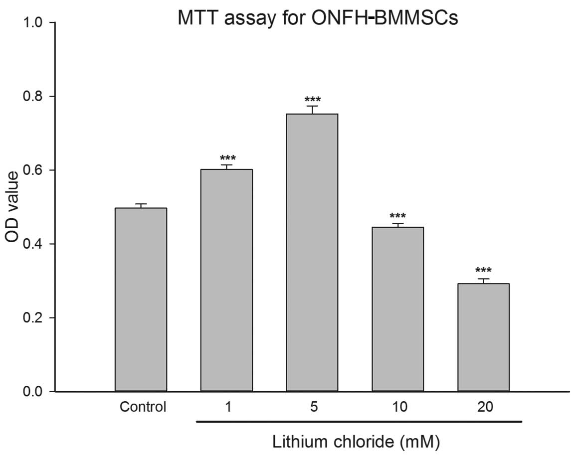 The ONFH-BMMSCs were plated into 96-well plates at a density of 2,000 cells/well. Following 4 h of incubation, some of the plates containing the ONFH-BMMSCs were treated with various concentrations of LiCl (1, 5, 10 and 20 mM; Sigma). The cells were then incubated at 37°C for 5 days. Following incubation, the cells were treated with methyl thiazolyl tetrazolium (MTT; 0.5 mg/ml) for 4 h at 37°C. Following solubilization with dimethyl sulfoxide, the absorbance was recorded at 570 nm using a microplate spectrophotometer (SpectraMax; Molecular Devices LLC, Sunnyvale, CA, USA).