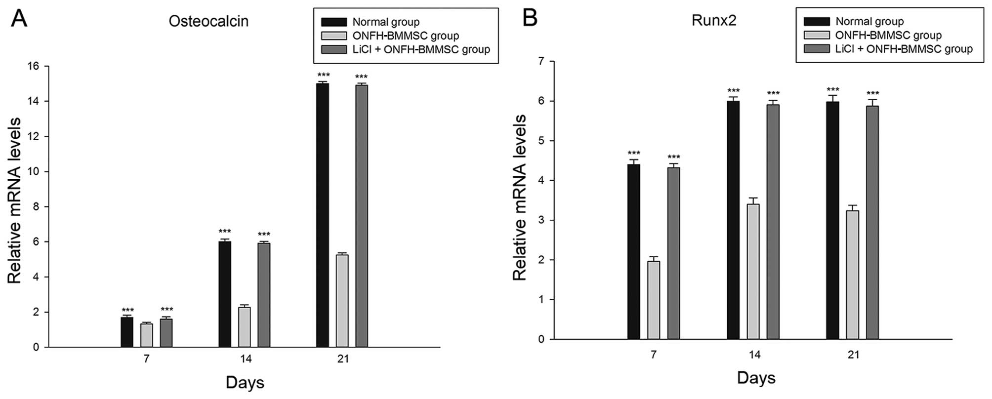 The results revealed that the 5 mM LiCl treatment group and the normal group exhibited a significant increase in the mRNA expression of OCN and Runx2 in a time-dependent manner compared with the ONFH-BMMSC group (P<0.001; Fig. 2). Furthermore, we found that the OCN and Runx2 mRNA levels did not significantly differ between the LiCl + ONFH-BMMSC group and the normal BMMSC group (P>0.05; Fig. 2).
