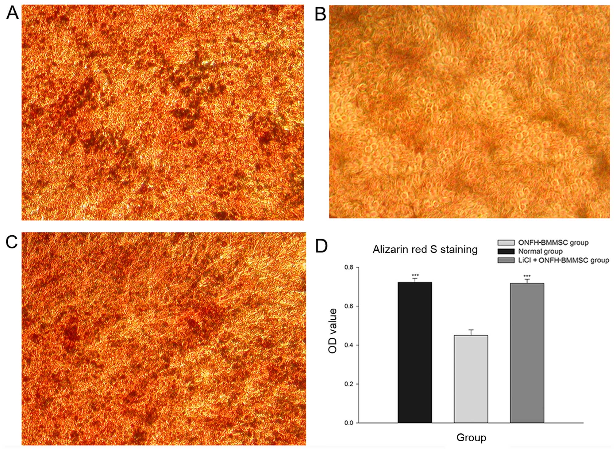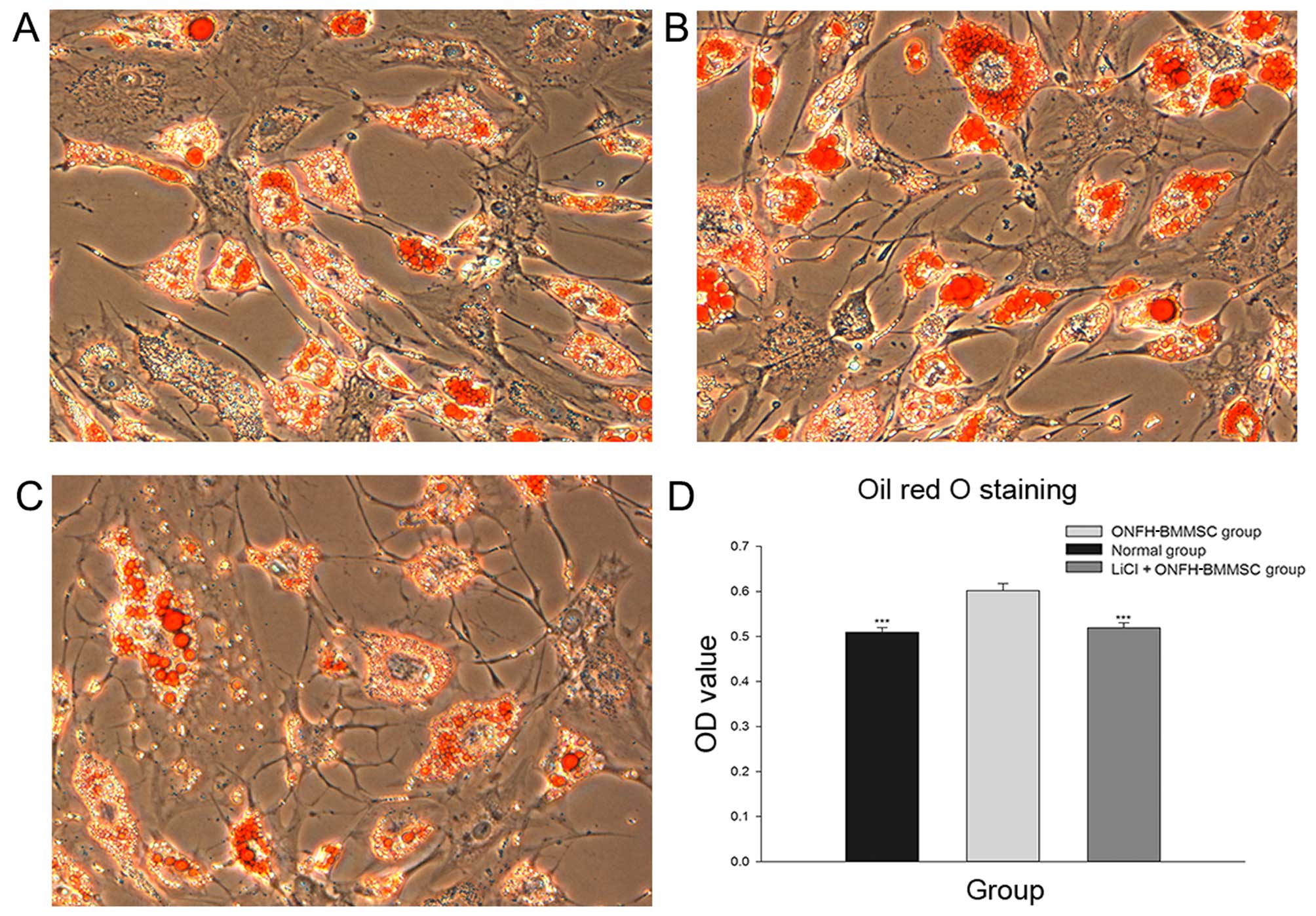 The results obtained from Oil Red O staining revealed that the normal and LiCl + ONFH-BMMSC groups presented with fewer lipid droplets than the ONFH-BMMSC group (Fig. 5A-C). Moreover, the light absorbance analysis revealed that the normal and LiCl + ONFH-BMMSC groups had significantly lower OD values than the ONFH-BMMSC group (P<0.001), while the OD values between the normal and the LiCl + ONFH-BMMSC groups did not differ (P>0.05; Fig. 5D).