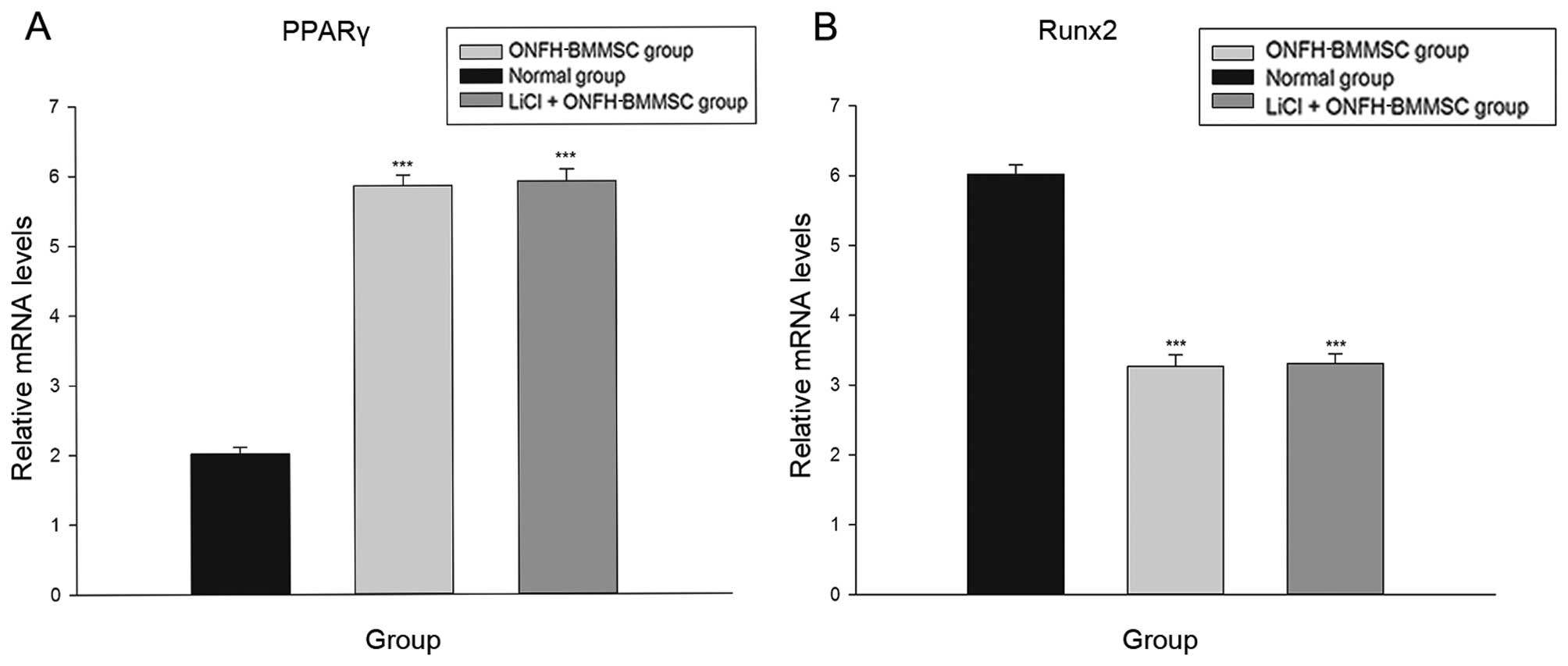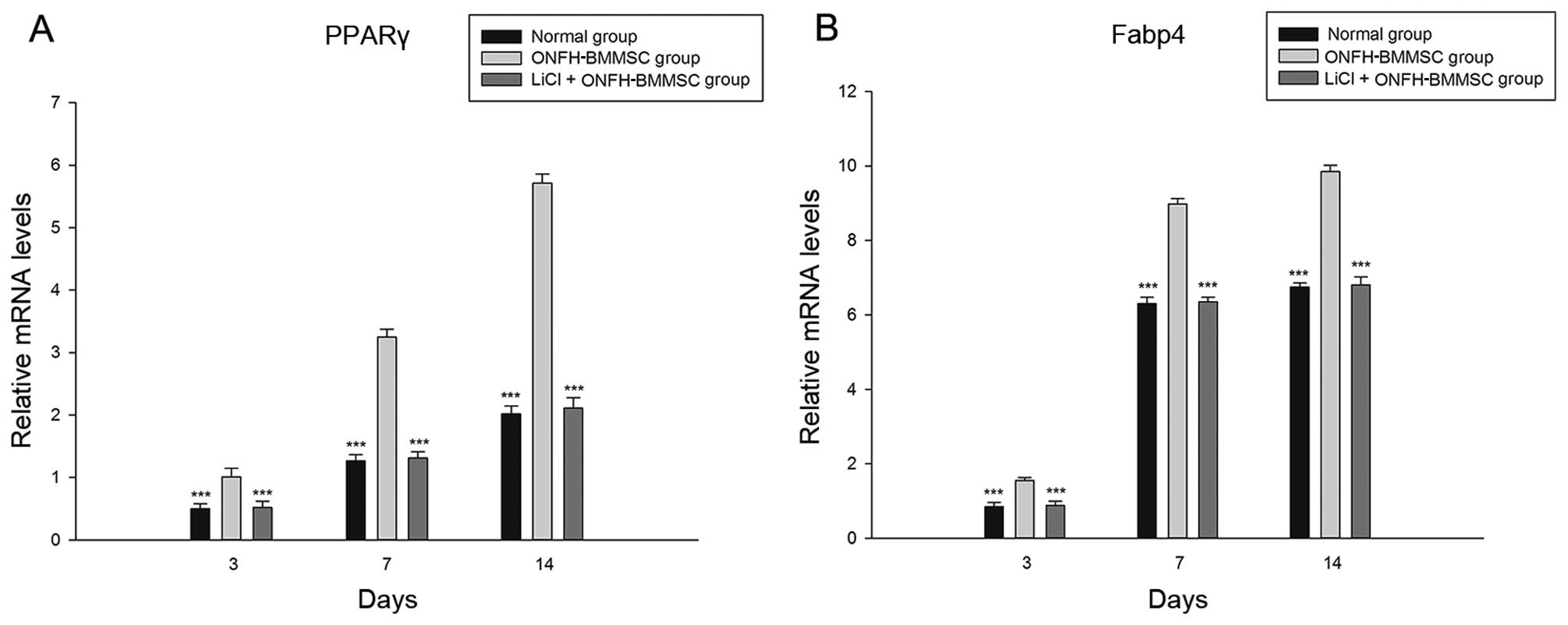 The LiCl treatment group and normal group exhibited a significant decrease in the mRNA expression of PPARγ and Fabp4 compared with the ONFH-BMMSC group (P<0.001, Fig. 4). Furthermore, we found that the LiCl treatment group showed no statistically significant differences in the PPARγ and Fabp4 mRNA expression levels compared with the normal BMMSC group (P>0.05; Fig. 4).