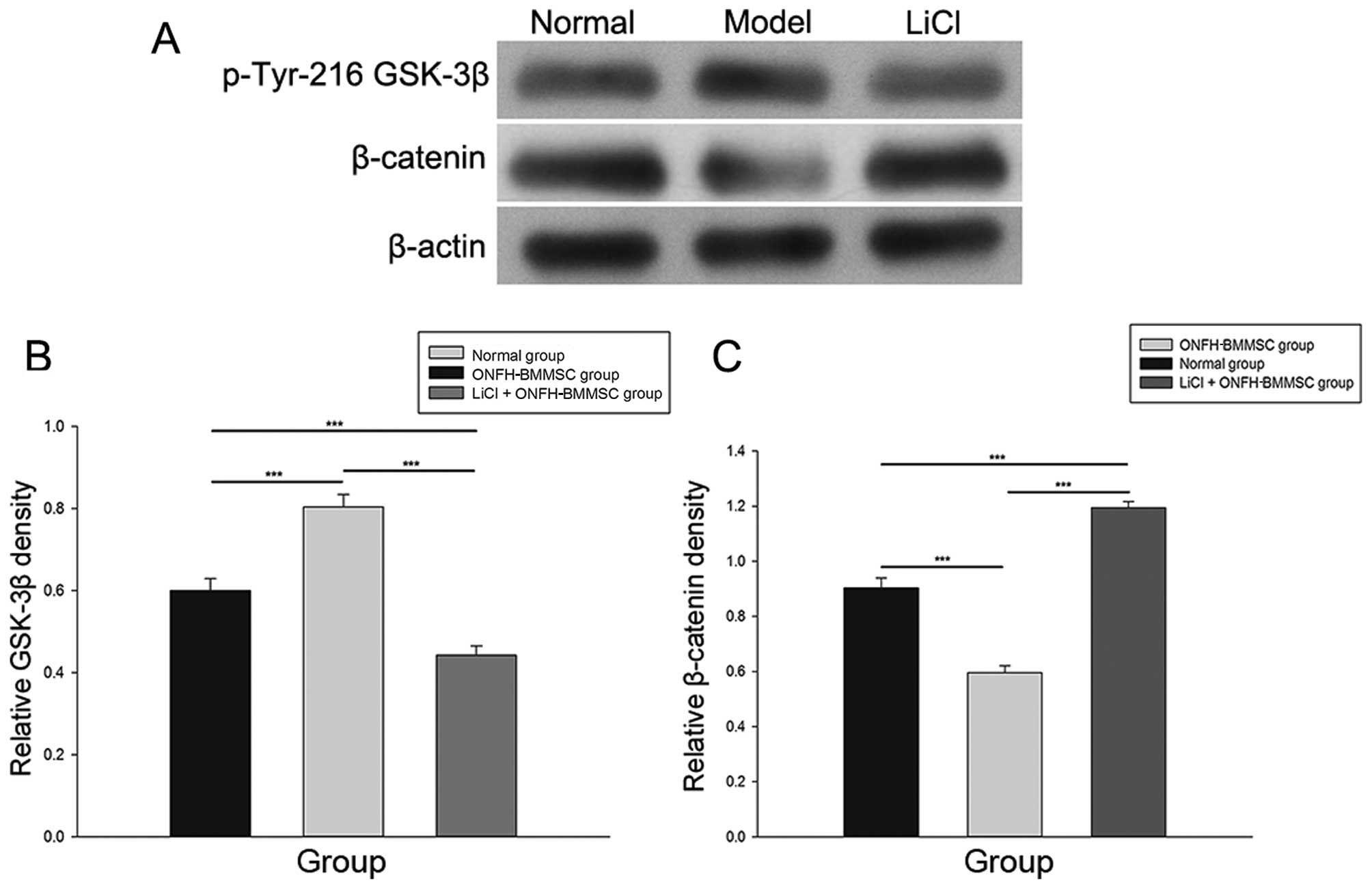 As shown in Fig. 6, treatment with LiCl markedly increased the expression of β-catenin and decreased the p-Tyr216 GSK-3β protein levels compared with the ONFH-BMMSC group (P<0.001). The normal group exhibited a higher expression of β-catenin and a lower expression of p-Tyr216 GSK-3β compared with the ONFH-BMMSC group (P<0.001).