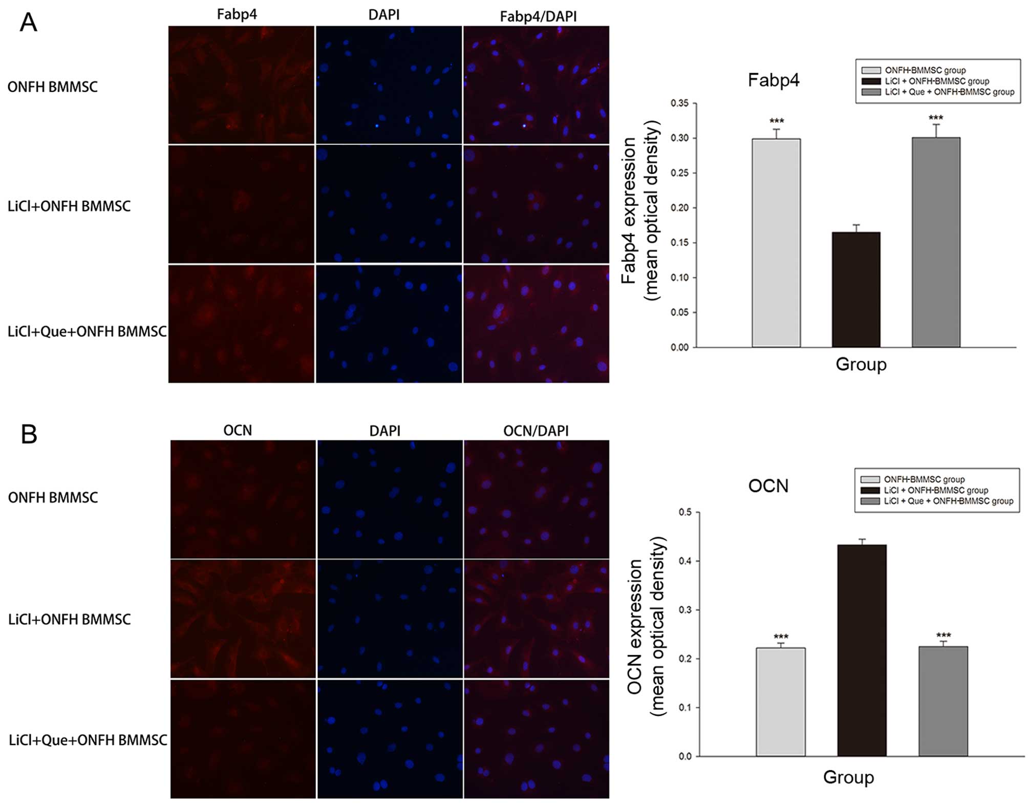 Immunofluorescence staining revealed that the LiCl + Que + ONFH-BMMSC and ONFH-BMMSC groups exhibited a significant increase in Fabp4 expression compared with the LiCl + ONFH group (P<0.001; Fig. 8A). By contrast, the LiCl + Que + ONFH-BMMSC and ONFH-BMMSC groups exhibited a significantly lower expression of OCN (P<0.001; Fig. 8B). Moreover, we also found that the LiCl + Que + ONFH-BMMSC group exhibited no statistically significant difference in Fabp4 and OCN expression compared with the ONFH-BMMSC group (P>0.05; Fig. 8).