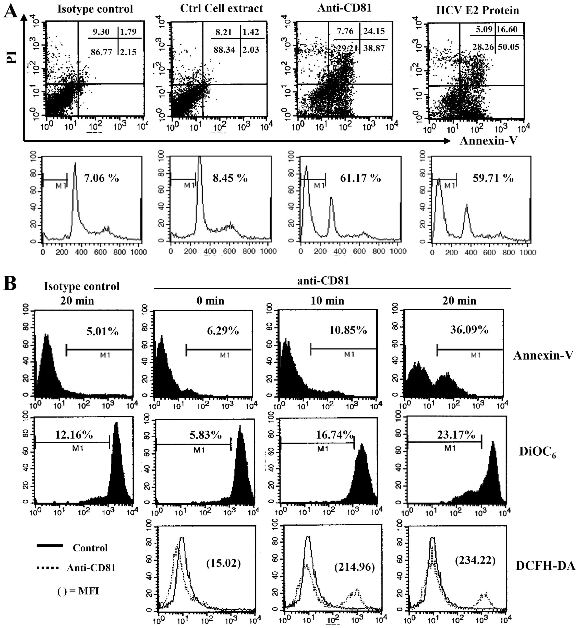 The above-mentioned results indicated that CD81 was upregulated by EBV infection. In addition, B cells pre-stimulated with various CD81 stimuli proliferated more rapidly following EBV infection than the healthy donor B cells through the production of LMP-1 and IL-10. However, the overexpression of CD81 by EBV-transformed B cells through stimulation with HCV E2 protein or anti-CD81 mAb inhibited cell proliferation (data not shown). In addition, we observed that the IL-10 mRNA level decreased abruptly at 3 or 4 weeks following CD81 stimulation, and the intracellular IL-10 protein level also dropped (Fig. 4A, lowest panel; Fig 4B, lowest lane). To investigate whether the overexpression of CD81 affects B cell survival and apoptosis, B cells transformed with EBV for 4 weeks and overexpressing CD-81 were stimulated with anti-CD81 mAb or HCV E2 protein. This induced the apoptosis of the EBV-transformed B cells. In addition, cell cycle analysis revealed that the stimulation with anti-CD81 mAb or HCV E2 resulted in a significant increase in the subG1 arrest of EBV-transformed B cells (Fig. 5A).