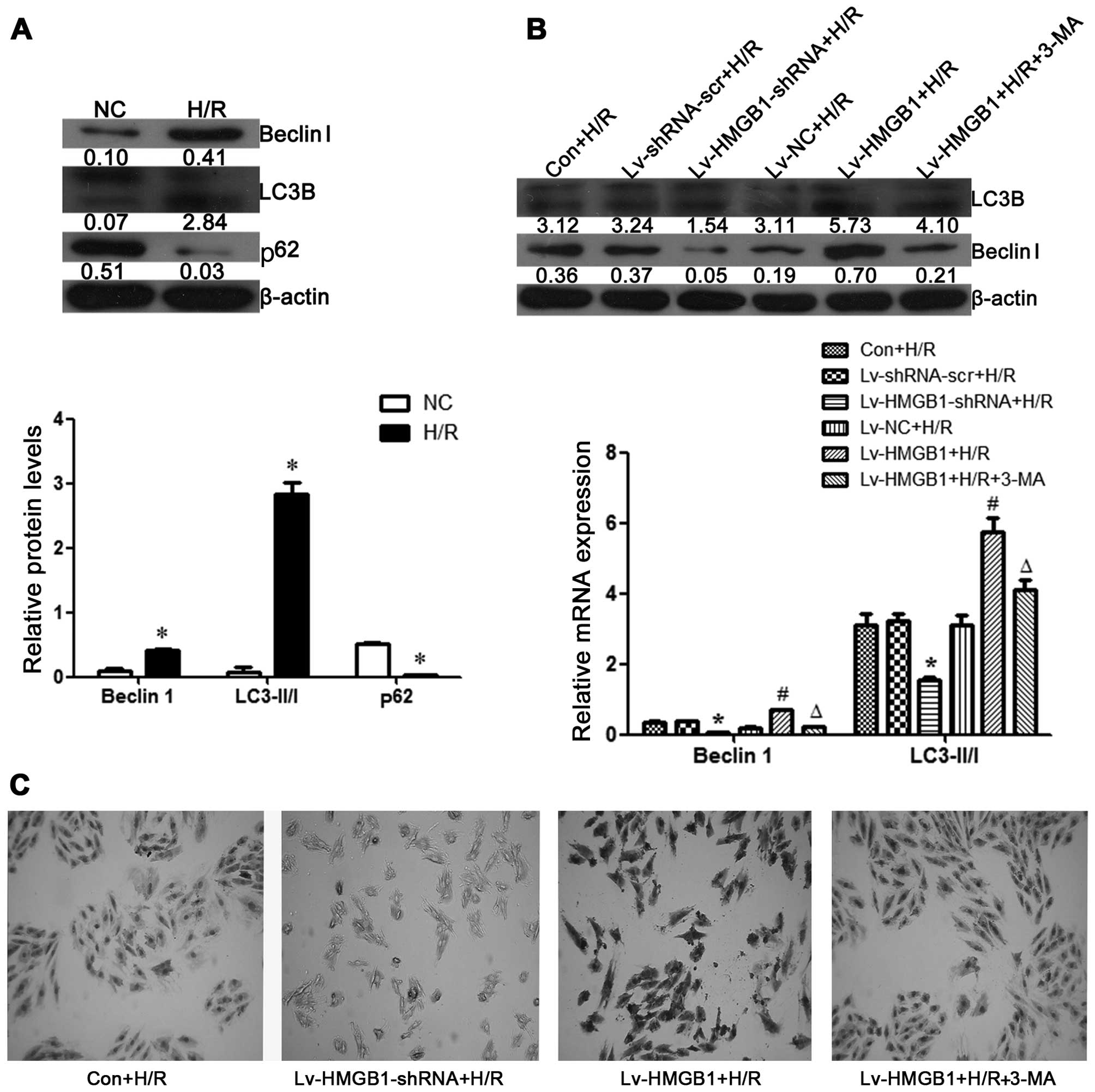 In this study, we also examined the effects of HMGB1 on H9c2 cell autophagy following H/R. We found that the protein levels of Beclin 1 and LC3-II/I were decreased when the cells were transfected with Lv-HMGB1-shRNA, whereas these levels were increased when the H9c2 cells were transfected with Lv-HMGB1 during H/R (p<0.05; Fig. 4B). Moreover, the content of Beclin 1 during H/R in the H9c2 cells was also determined by performing ICC. The results revealed that the content of Beclin 1 was decreased when the cells were transfected with Lv-HMGB1-shRNA, whereas it was increased when the H9c2 cells were transfected with Lv-HMGB1 during H/R. The Beclin 1 content was also decreased following treatment of the cells with 3-MA (an autophagy inhibitor) (p<0.05; Fig. 4C).