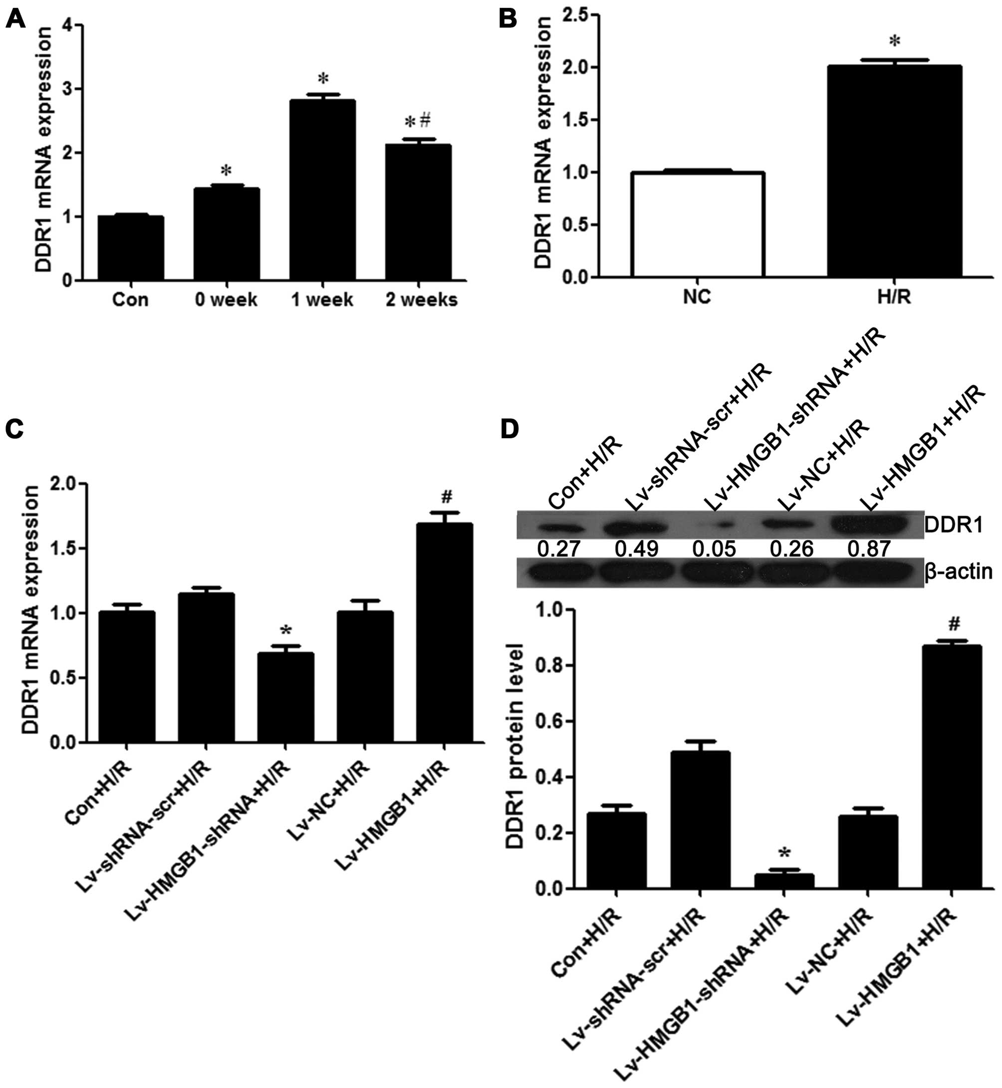 In order to further explore the mechanisms of action of HMGB1 and its effects on autophagy during H/R in cardiomyocytes, the expression of DDR1 in myocardial tissue from rats with H/R injury and in H9c2 cells subjected to H/R injury was determined by RT-qPCR and western blot analysis. The results revealed that the mRNA expression of DDR1 was significantly increased at weeks 1 and 2 post-MI in the tissue with myocardial necrosis from the rats with I/R injury when compared with the control heart tissue from the sham-operated rats (p<0.05; Fig. 5A). Compared to the control group, the mRNA expression of DDR1 was increased during H//R in the H9c2 cells (p<0.05; Fig. 5B). For further investigations on the regulatory effects of HMGB1 on the expression of DDR1 during H/R in cardiomyocytes, the mRNA and protein levels of DDR1 were measured following transfection of the H9c2 cells with either Lv-HMGB1-shRNA or Lv-HMGB1. The results revealed that DDR1 expression was decreased when the H9c2 cells were transfected with Lv-HMGB1-shRNA during H/R, whereas it was increased when the cells were transfected with Lv-HMGB1 during H/R (p<0.05; Fig. 5C and D).