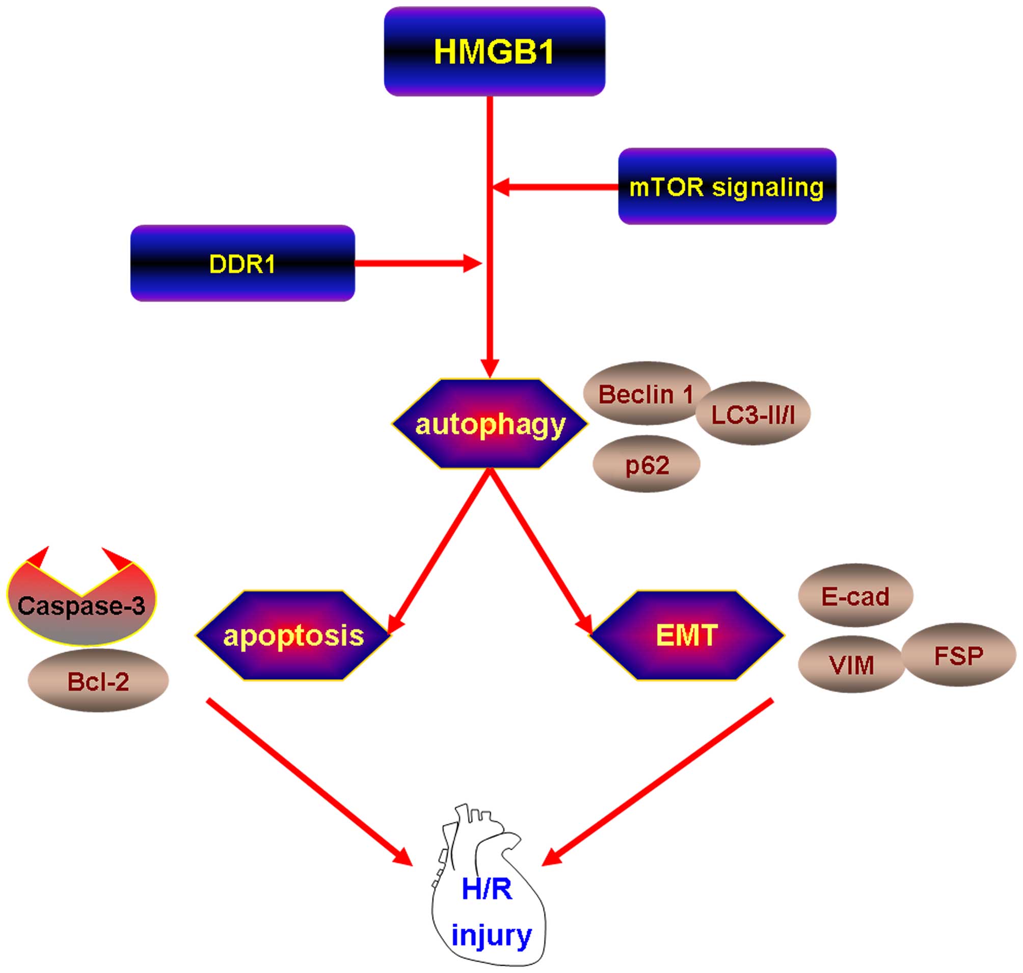 In conclusion, the findings of our study demonstrated the following: i) the expression of HMGB1 was upregulated in the myocardial tissue of rats with MI and following H/R injury to H9c2 cells; ii) HMGB1 promoted apoptosis and EMT during H/R in H9c2 cells; iii) in association with the induction of autophagy, HMGB1 induces apoptosis and EMT following H/R in H9c2 cells; iv) HMGB1 induced autophagy by upregulating the expression of DDR1 and downregulating the phosphorylation of mTOR (Fig. 7). Thus, it can be concluded that HMGB1 promotes apoptosis and EMT in association with the induction of autophagy through the upregulation of the expression of DDR1 and the downregulation of the phosphorylation of mTOR following H/R injury in cardiomyocytes.