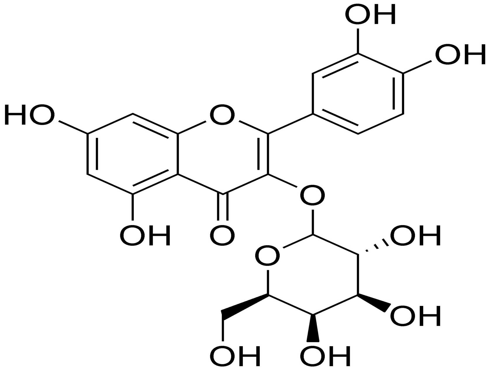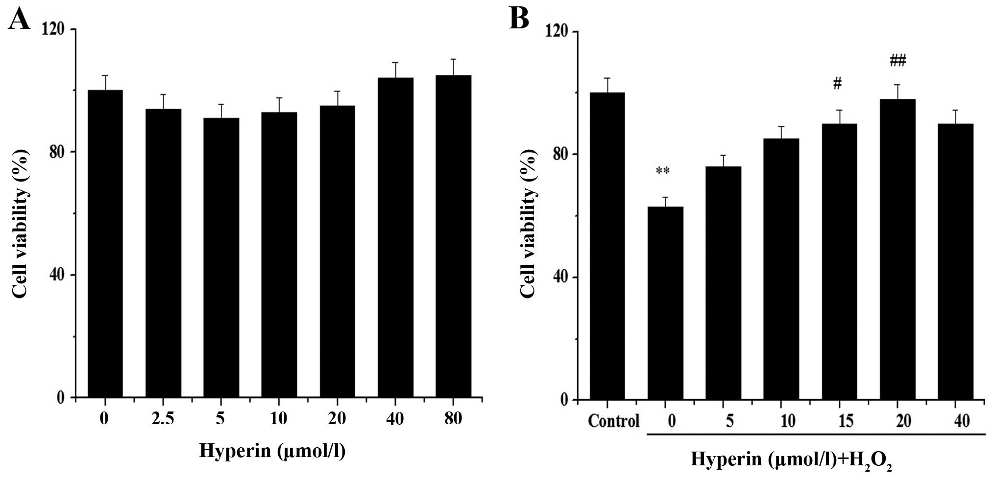 Flavonoids are polyphenolic compounds that are widespread in many plants, and exert various biochemical and pharmacological effects (5). Hyperin (quercetin-3-O-galactoside) is considered the major bioactive flavonoid component in the medicinal herb, Apocynum venetum L., which has been used extensively for the treatment of hypertension in Chinese medicine. Previous studeis have suggested that hyperin plays various biological roles, including anti-inflammatory (6,7), cytoprotective (8) and anti-ischemic roles (9). Our previous study revealed that hyperin protects cells from H2O2-induced injury (10). However, its underlying mode of action has not yet been elucidated.