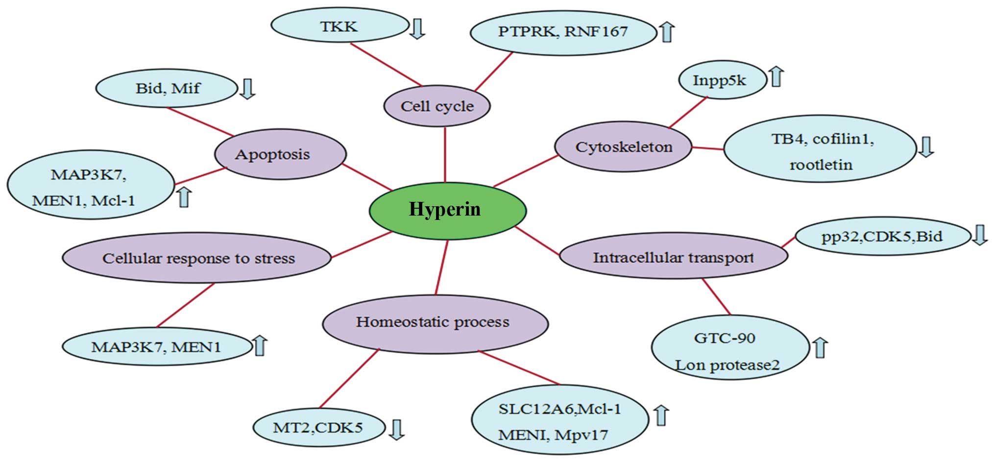 Following treatment with hyperin, of the 250 proteins that exhibited altered expression upon H2O2 exposure, 52 revealed a tendency towards restoration of the expression levels (Table I). Compared with the H2O2 group, 28 proteins were downregulated and 24 were upregulated. These proteins were associated with apoptosis, cell cycle and cytoskeleton organization.