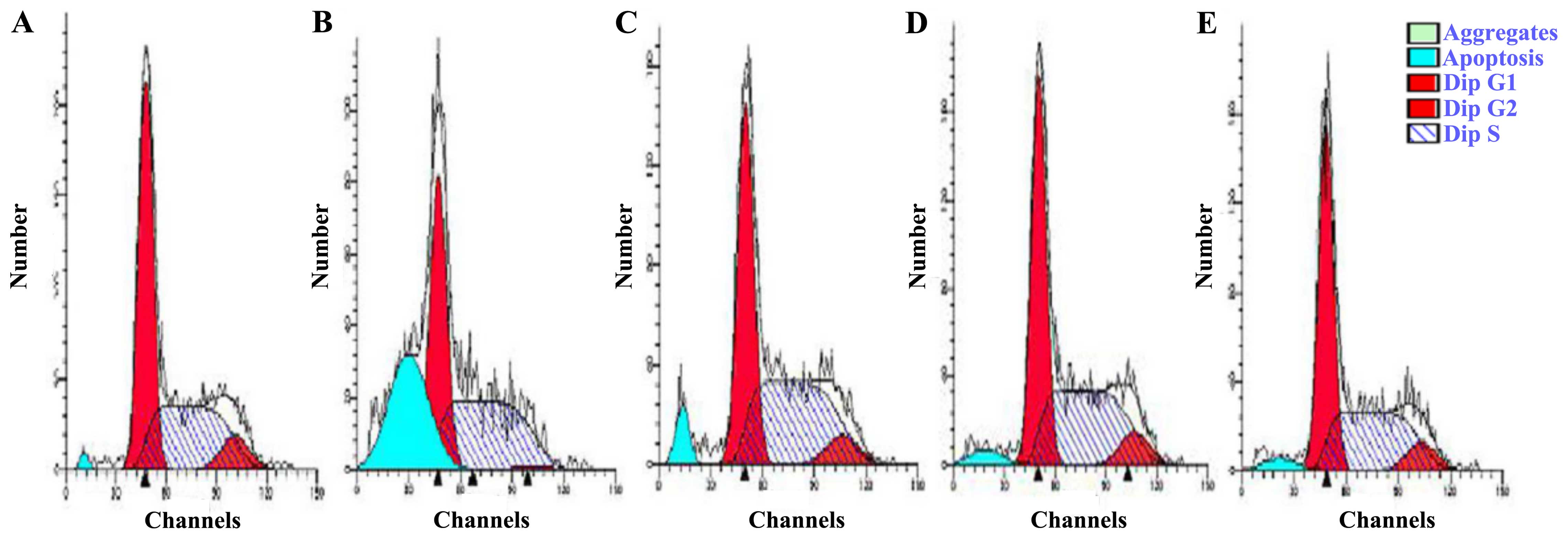 Quantitative detection of apoptotic cells and analysis of cell cycle distribution in the cultures were undertaken using flow cytometry. The EA.hy926 cells treated with different concentrations of hyperin and/or exposed to 200 μmol/l H2O2 were collected by centrifugation (138 × g for 5 min) and cell density was adjusted to 1×105 cells/ml. The cells were washed twice with cold PBS and centrifuged (138 × g for 5 min). The pellets were fixed overnight in pre-cooled 70% (v/v) ethanol at 4°C, and then washed with cold PBS. The cells were suspended in 1 ml of propidium iodide solution (20 mg/ml) supplemented with 0.25 mg/ml RNase A and 0.1% (v/v) Triton X-100, and incubated on ice for 30 min in the dark. The samples were analyzed with a FACSCalibur flow cytometer (BD Biosciences, San Jose, CA, USA).
