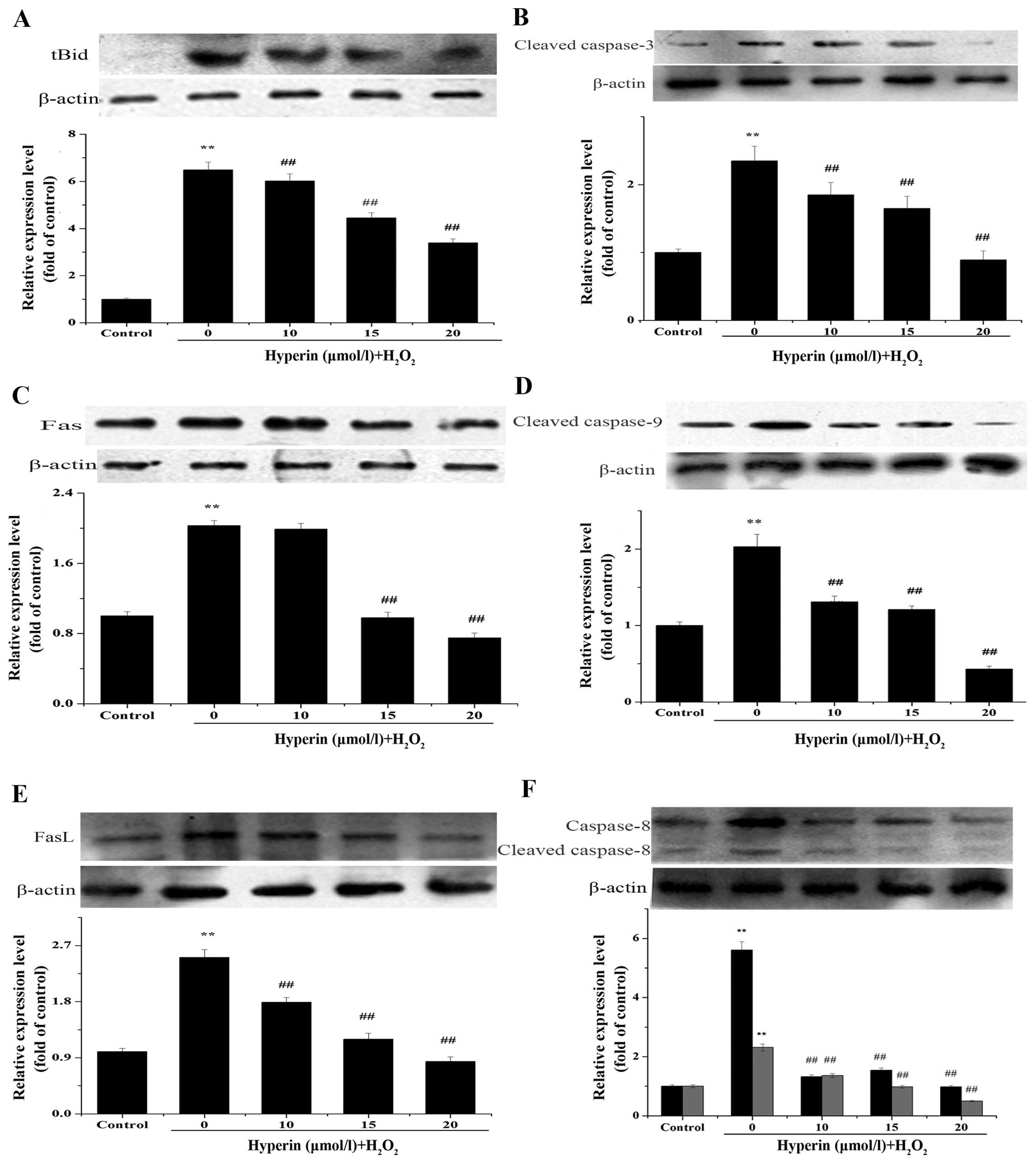 Fas, FasL, cleaved caspase-3, -8, -9 play important roles in apoptosis. tBid is the cleaved form of Bid and is involved in the mitochondrial apoptotic pathway (22,23). The expression of these proteins was assayed by western blot analysis to clarify the role of the Bid- and Mcl-1-mediated apoptosis mechanism in H2O2-injured EA.hy926 cells and the effect of hyperin. As shown in Fig. 6A–F, hyperin significantly decreased the relative expression of these proteins compared to that in the H2O2 group, in a dose-dependent manner.