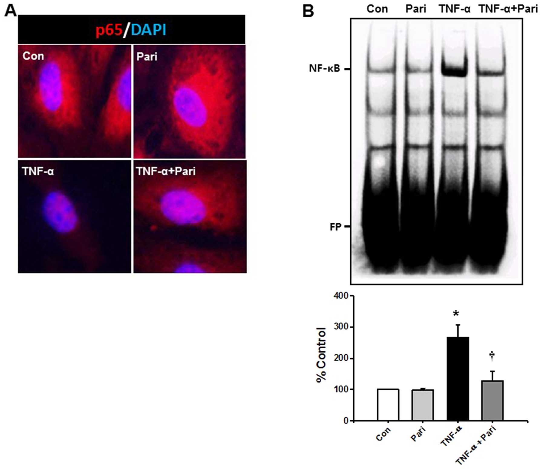 The NF-κB signaling pathway is a major signaling pathway involved in the TNF-α-induced expression of cell adhesion molecules. Therefore, we examined the effects of paricalcitol on the TNF-α-induced activation of the NF-κB signaling pathway using immunocytochemistry and EMSA. p65 protein was abundant in the cytoplasm of the control- and paricalcitol-treated cells. However, TNF-α decreased the cytoplasmic expression of p65 in the HUVECs. Pre-treatment with paricalcitol prevented the TNF-α-induced depletion of cytoplasmic p65 in the HUVECs (Fig. 2A).